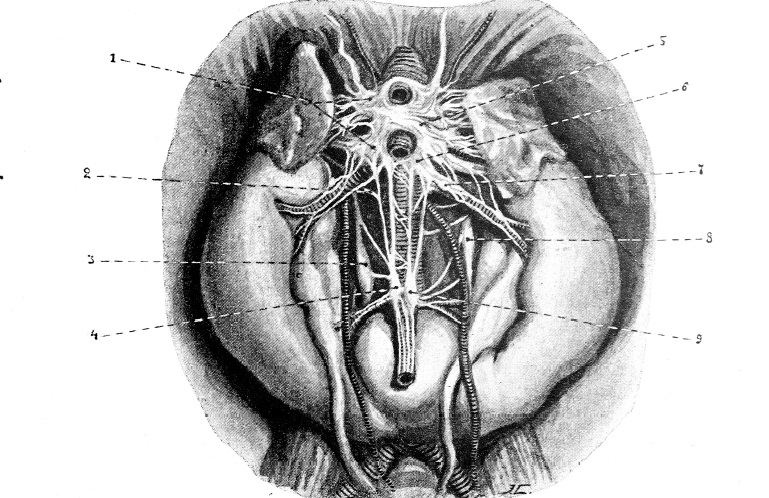 Рис. 2. 1-g. semilunare dext.; 2-N. splanchn. infer dext.; 3-пограничный столб n. symathici (справа).;4-g. mesent sup. sinist.;7-g. aortico-renale sinist.; 8-пограничный столб n. sympathici (слева). 9-g. mesent. inf. sinist.