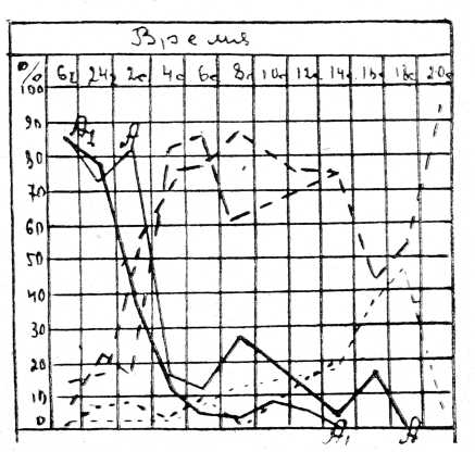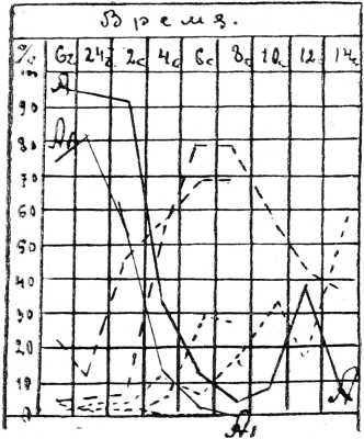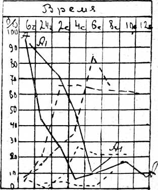 Результаты опытов графически изображались на таблицах, из которых в качестве примера приведено 3 таблицы. Приводить прочие опыты мы сочли излишним, т. к. все они протекали почти одинаково, отличаясь только деталями и продолжительностью. Методика и время добывания экссудата одинаковы, как и в ранее опубликованном сообщении.
