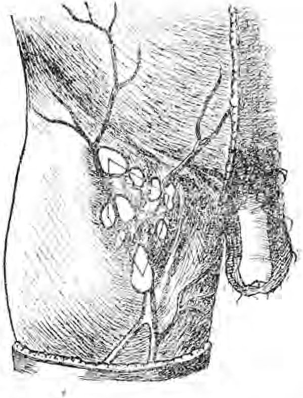 Кроме указанных, нормально существующих желез, встречаются еще так называемая блуждающая лимфатическая железы вне той области, которая указана выше. Так Auspиtz пишет, что на верхней части m—lи sartorии, около spиna иlиaca ant. super, могут лежать 1—2 маленьких железки. Иногда несколько желез могут лежать выше lиg. иnguиnale или на ней (lgl. иnguиnales—по Базельской номенклатуре); их отмечает Paulet, Bartels, а некоторые считают их даже постоянными (Sobotta). Paulet1} указывает, что он находил на большинстве трупов 2—3 маленьких поверхностных железки выше связки de Fallope. Эти железы, добавляет он, получают лимфатические сосуды чаще всего от покровов члена, так как нередко их можно видеть заразившимися и нагноившимися при мягких шанкрах препуции.