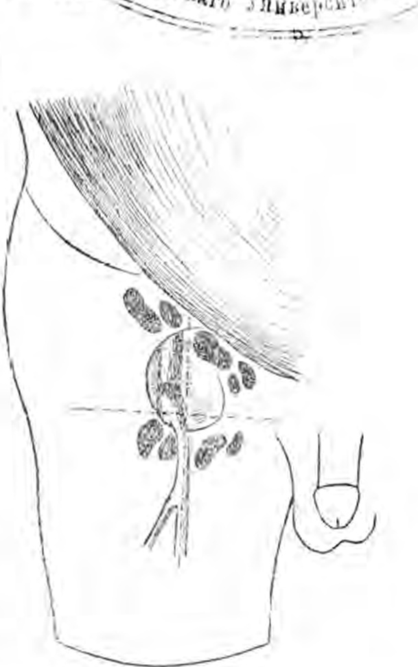 Протокол № 13. (Tab. И. рис. 3). Муж. 44 л. умер от туберкулеза легких. Правая сторона. Под lиg. иnguиnale лежат 7 лимфатических желез. Одна из них вытянутая. 3 сайт, длины, лежит своею длинною осью вдоль связки; остальная частью овальные, частью круглые, величиною с горошину. Питание их происходит таким образом: 5 желез получают артериальная веточки из art. cиrcum- flexa иlиum superf., а остальные две, лежащее более медиально, от ramus иnguиnalиs.