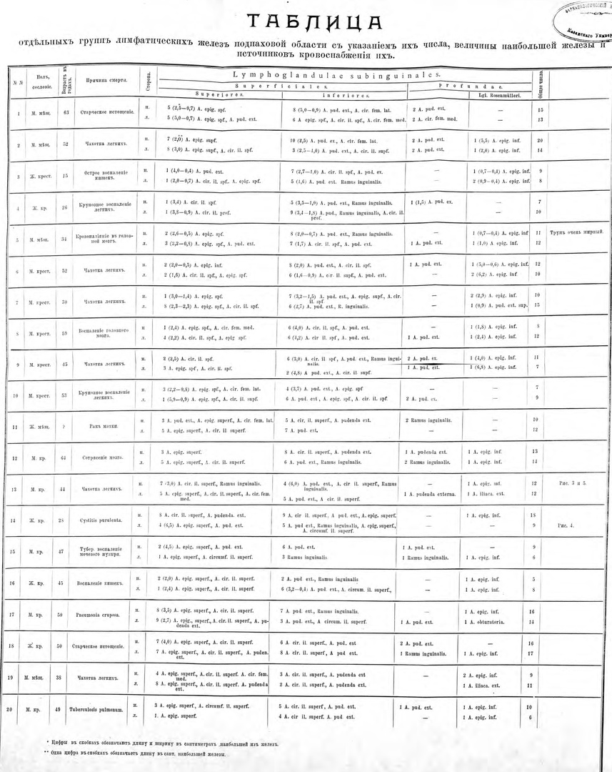 Теперь я перехожу к разбору литературных данных в связи с полученными результатами собственных изследованей. Из приведенных выше литературных справок видно, что все предложенныя классификацеи основаны на принципе топографическаго расположенея паховых желез. Кроме этого, как известно, можно делить лимфатическея железы еще по областям полученея ими лимфы. Но подобное деленее не может иметь никакого практическаго значенея, так как обыкновенно из одной и той же области лимфатическее сосуды идут к многим железам, лежащим иногда на далеком разстоянеи друг от друга и пичем не отличающимся от других, кругом лежащих лимфатических желез, принимающих лимфу из других областей. Кроме того, лимфатическея железы соединены между собою многочисленными лимфатическими сосудами и образуют как бы сплетенее, почему даже и при инекцеи не всегда возможно определить, из какой области получает лимфу данная железа.