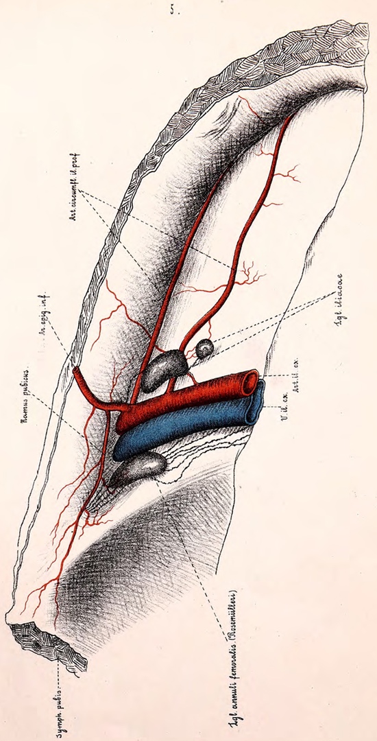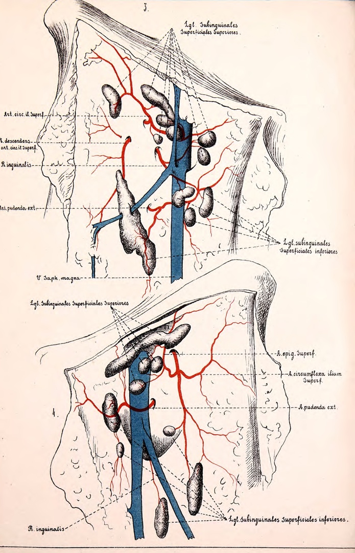 В последнем изданеи руководства по анатомеи Раубера в обработке Копша имеется рисунок бедряной артереи с ея ветвями. На этом же рисунке изображены паховыя лимфатическея железы с подходящими к ним артереальными веточками: 1) от art. epиgastrиca superfиcиalиs, 2) от art. cиrcumflexa иlиum superfиcиalиs и 3) от art. pudenda externa. Соответствующаго обясненея к рисунку в тексте, к сожаленею, не имеется (ст. 395).