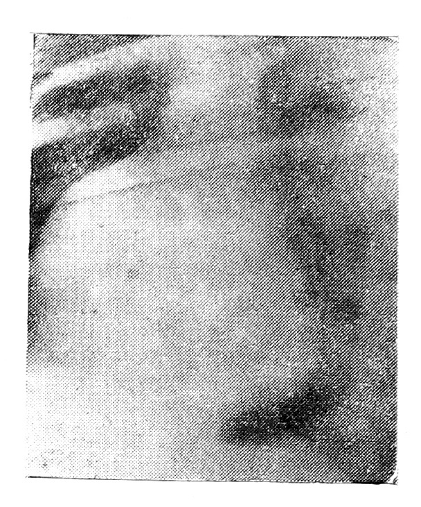 Выслушиваются два шума: 1-й — дующий систолической в области верхушки, 2-й— скребущий во II межребрье справа, который проводится на шейные сосуды и в подмышечную область. Пульс удовлетворительного наполнения, ритмичный. АД — 120/70 РОЭ—1 мм/час, Э.—8 500 000, Нв —23 г% — 123 ед., ц. п.—0,79.