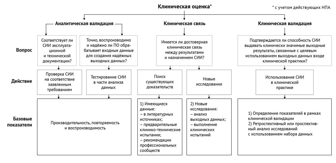 3) клиническую валидацию — подтверждение способности СИИ выдавать клинически значимые выходные результаты, связанные с целевым использованием выходных данных входе клинической практики.