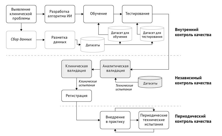Международное регулирование систем на основе ИИ в медицине. На текущий момент нет полноценной нормативно-правовой базы, систем контроля и достаточного опыта работы в области технологий ИИ в мире. Для примера, директивы ведущего мирового сообщества компетентных органов в сфере регулирования медицинских изделий разных стран мира (IMDRF — от англ. International Medical Device Regulators Forum) [18], а также нормативное руководство Health Sciences Authority (Сингапур) описывают жизненный цикл и подходы к оценке программного обеспечения как медицинского изделия, но они не учитывают особенности технологий ИИ [19].