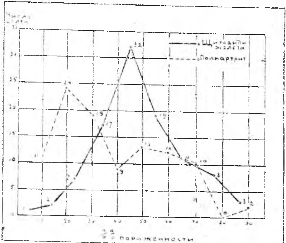Увеличение щитовидной железы (внешний критерий измененной функции) не идет параллельно с поражением суставов. В одном селении может быть 5% полиартрита, в другом -50%, при 50% увеличении щ. ж. в обоих селениях. Для 100 селений имеем диаграмму частот увеличения щ. ж. и полиартрита: