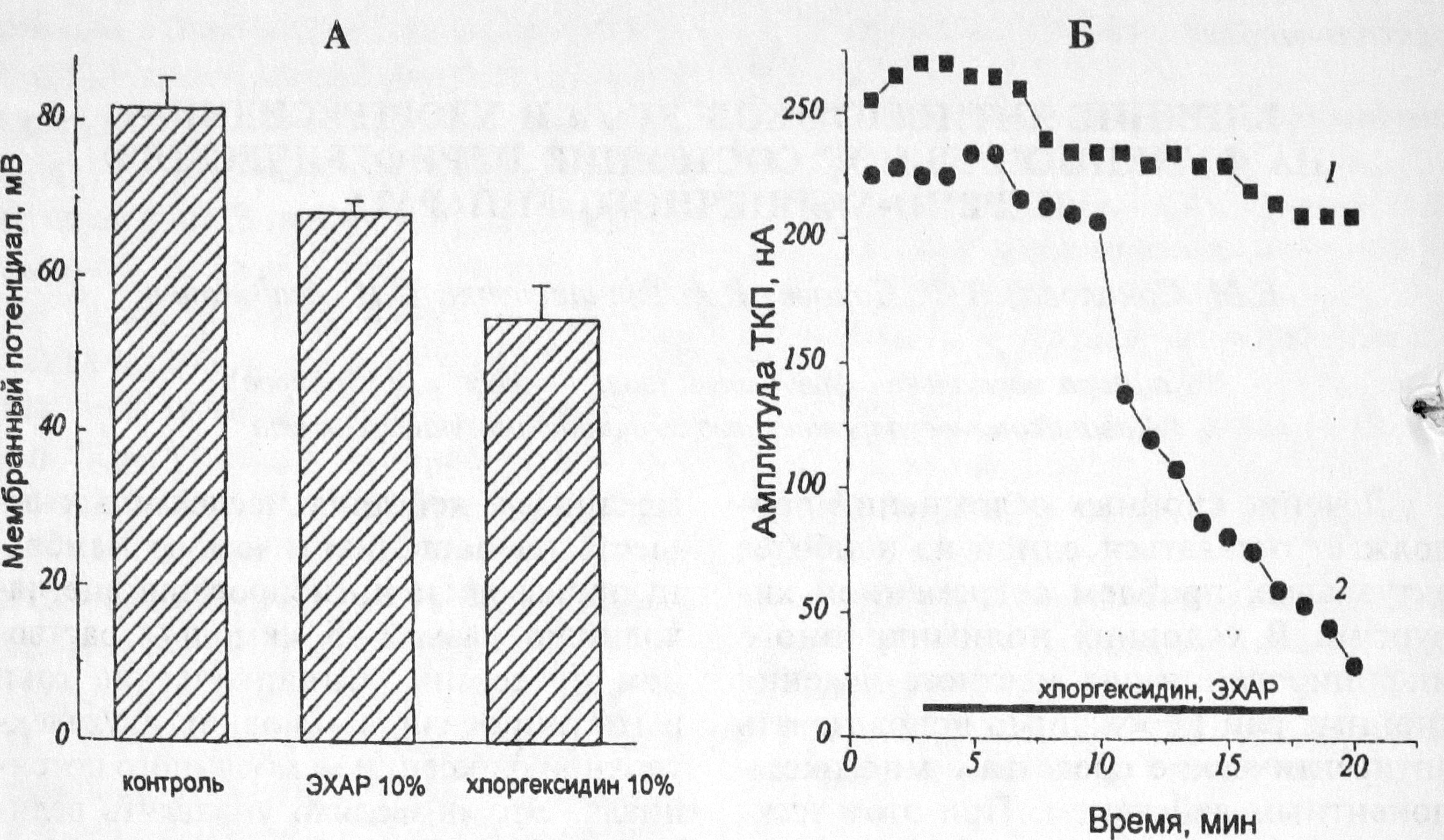 На А: на оси абсцисс столбиками указаны контроль, ЭХАР и хлоргексидин, на оси ординат — величина мембранного потенциала (мВ). Значения мембранного потенциала представлены на 20-й минуте перфузии ЭХАРа и хлоргексидина.