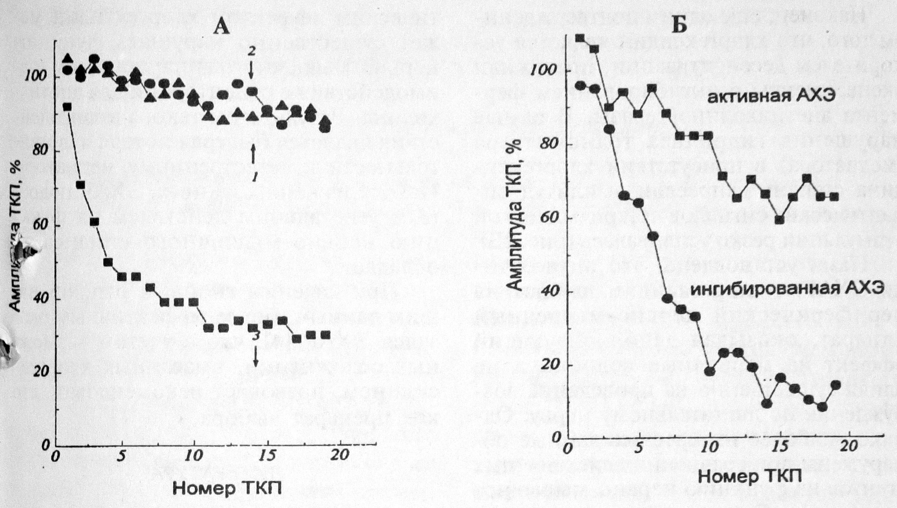 Наконец, еще одним подтверждением того, что хлоргексидин является ускорителем десенситизации, послужили эксперименты с ингибированием фермента ацетилхолинэстеразы. В случае нарушения гидролиза трансмиттера (медиатора) в присутствии хлоргексидина степень депрессии амплитуд синаптических сигналов при ритмической стимуляции резко усиливалась (рис. 2Б).
