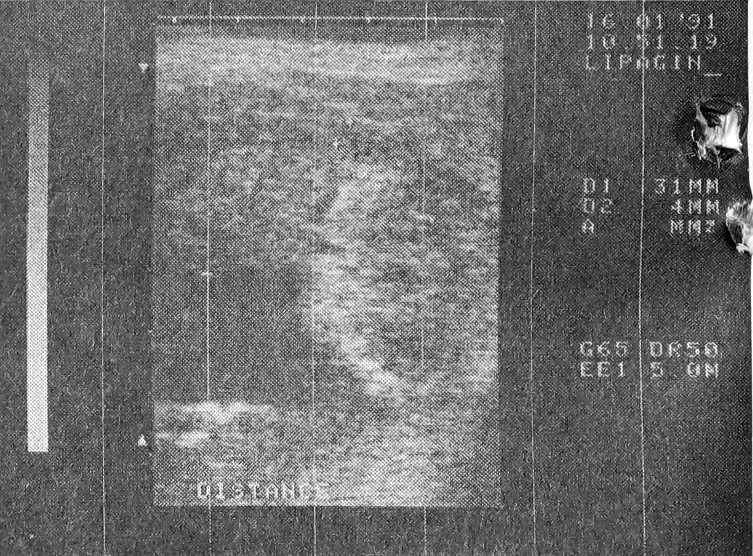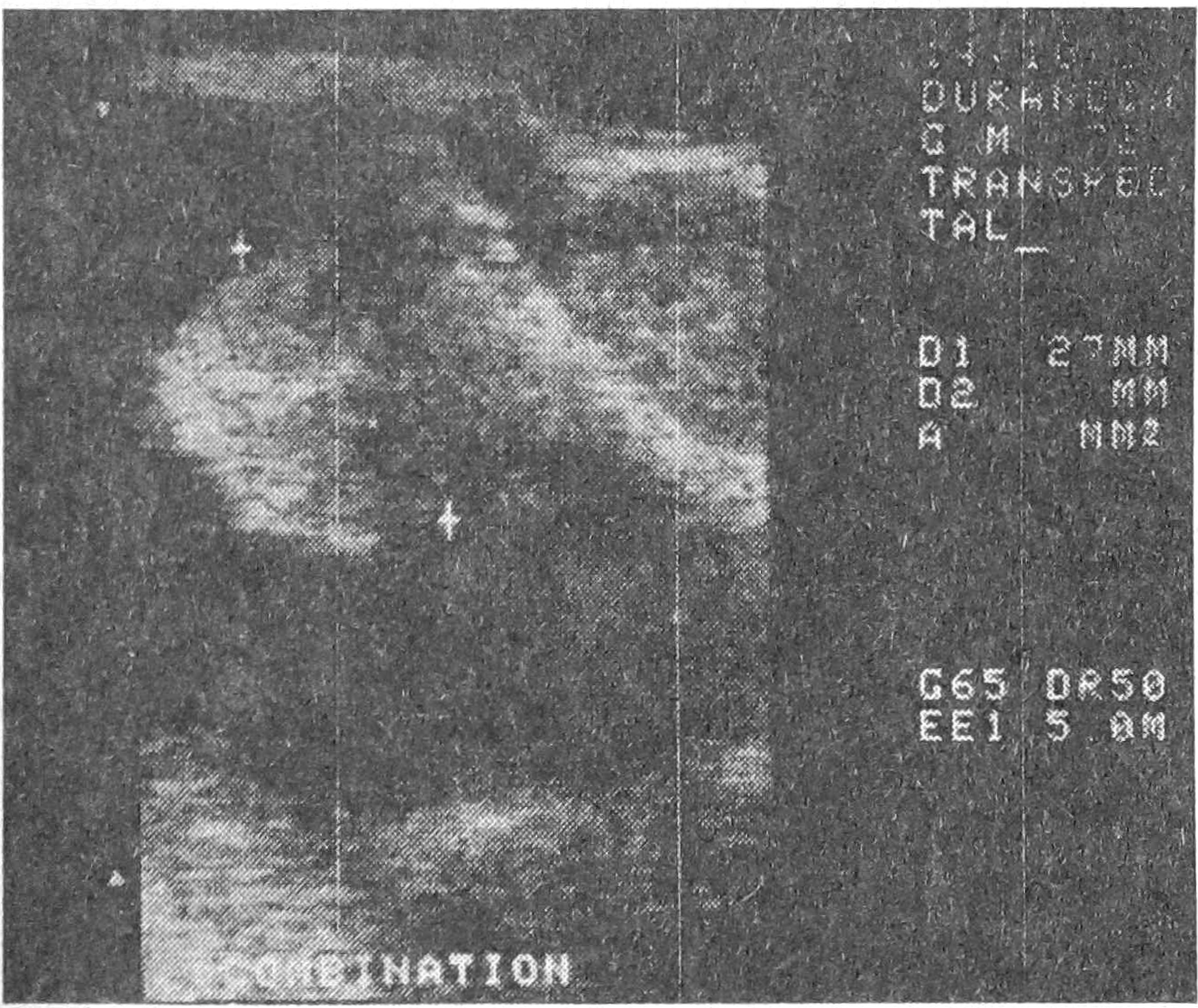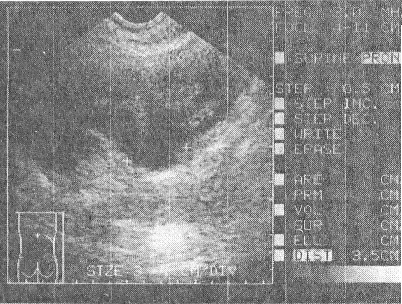 При инвазии опухоли в соседние органы возникает проблема дифференциальной позволяет определить принадлежность опухоли, уточнить локализацию и стадию новообразования даже при недостаточной емкости мочевого пузыря [1, 2]. При использовании линейного трансректального датчика (“Тошиба” — SAZ 35А, 5 мГц) по сравнению с ротационным (“Брюль и Къер” 1846, 5 мГц) сонографическая картина представляет собой сагиттальное изображение не только шейки мочевого пузыря, но и предстательной железы, семенных пузырьков и окружающих тканей (рис. 1). Однако не всегда при инвазивных формах рака представляется возможным точно определить границу и первичный опухолевый компонент только на основании диагностики новообразований предстательной железы и мочевого пузыря при локализации последнего в области шейки [6]. Трансректальное ультразвуковое сканирование в таких случаях эхографических признаков. Солидные формы рака мочевого пузыря с выраженным эндофитным ростом, прорастающие в предстательную железу широким фронтом, имеют на ультрасонограммах гипоэхогенную или смешанную эхоструктуру, приближаясь по характеру к эхоструктуре предстательной железы (рис. 2), и трудно поддаются дифференцировке. Интимный анатомический контакт шейки мочевого пузыря и краниального отдела предстательной железы, как правило, не позволяет дифференцировать рак мочевого пузыря в стадии Т3а и таковой в стадии Т3б что еще более затрудняет выбор лечебной тактики.