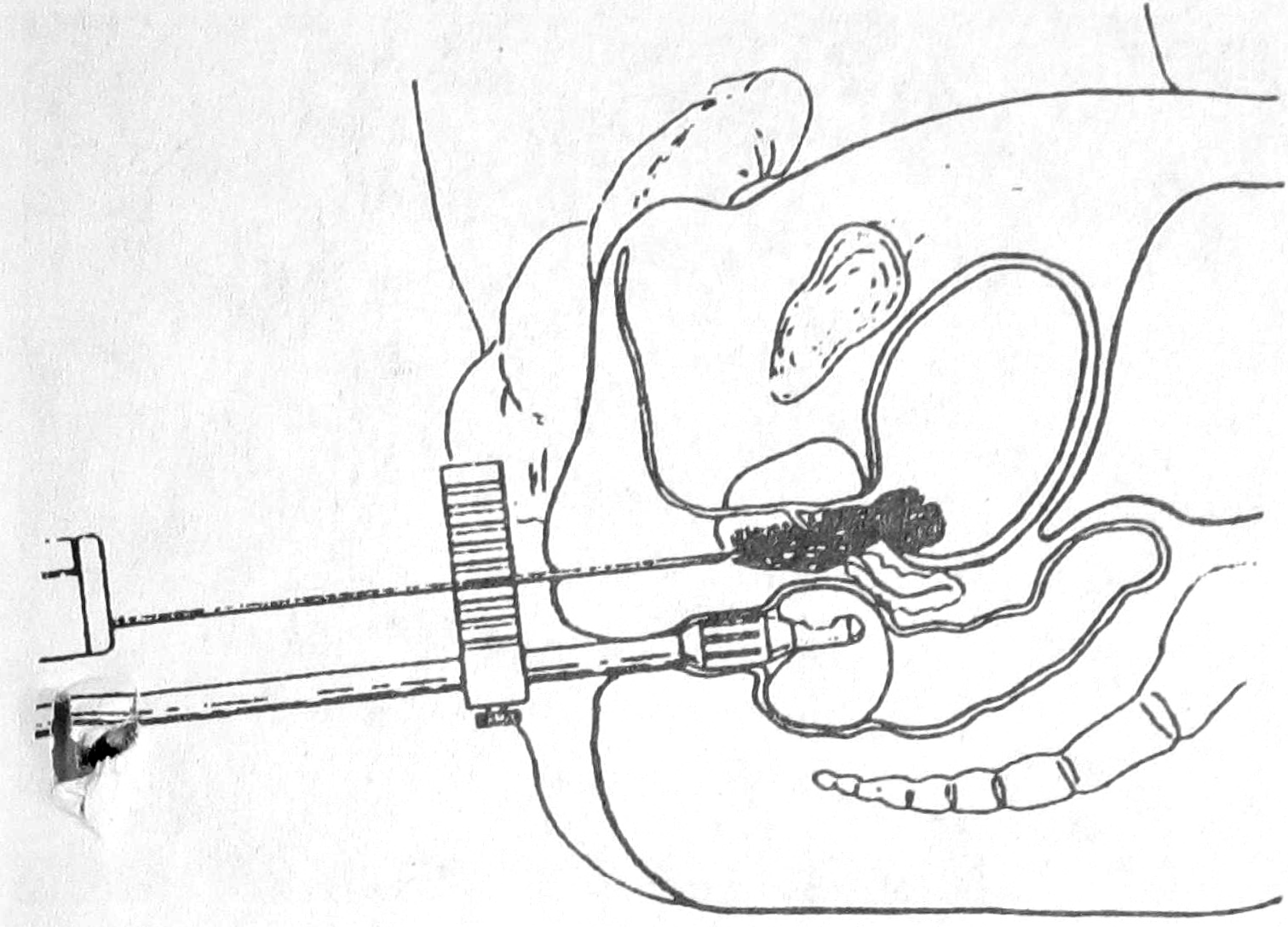 В отношении оценки характера ультразвуковой картины при раке предстательной железы мнения достаточно противоречивы и расходятся они прежде всего по вопросам специфичности эхо-симптомов, патогномоничных для форм рака, имеющих гипер- и гипоэхогенный характер, а также смешанную эхоструктуру [7, 8]. Отсюда возникают трудности при попытке дифференцировать эхогенность измененных участков предстательной железы при инвазивных формах рака шейки мочевого пузыря. Нельзя исключить и сочетанное поражение мочеполовой системы, когда при раке мочевого пузыря имеется опухоль предстательной железы, что создает значительные сложности не только в диагностике, но и в выборе адекватного метода лечения. Характерная для низкодифференцированной аденокарциномы гетерогенность эхоструктуры, а также гипоэхогенносгь очагов при высокодифференцированных начальных стадиях рака предстательной железы не могут являться основанием для исключения местного распространения рака мочевого пузыря ввиду значительной общности и вариабельности ультразвуковой картины. Нарушение целостности капсулы предстательной железы и наличие опухолевого компонента в парапростатической и паравезикальной клетчатке или в семенных пузырьках свидетельствуют о далеко зашедшей стадии заболевания (Т4), но такое заключение должно быть четко аргументировано морфологически для назначения соответствующего комбинированного лечения, имеющего коренные отличия при раке мочевого пузыря и предстательной железы. В таких случаях нами проводилась трансперинеальная биопсия предстательной железы под ультразвуковым контролем [4] при помощи трансректального ротационного датчика, снабженного пункционным адаптером (рис. 3). Манипуляцию осуществляли под местной анестезией в положении больного, характерном для операции на промежности. После совмещения ультразвукового изображения интересующего отдела предстательной железы с пункционной разметкой движения иглы выполняли биопсию под постоянным сонографическим контролем. Для взятия биопсийного материала и патоморфологического исследования в работе использовали иглы типа “TRU-CUT”. Для исключения недостоверных результатов и мультифокального опухолевого роста производили многофокусную биопсию из нескольких точек.