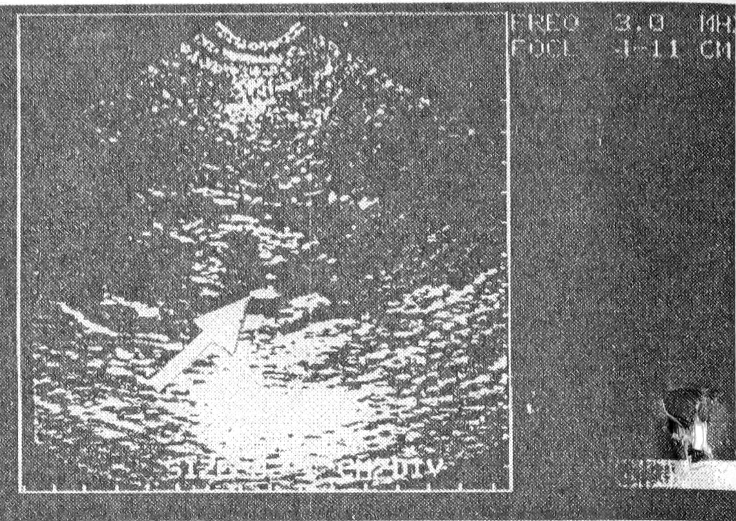 Рис. 5. Ультрасонограмма почки в момент пункции чашечно-лоханочной системы (cтрелкой указано направление пункционного хода и кончик иглы в нижней чашечке).