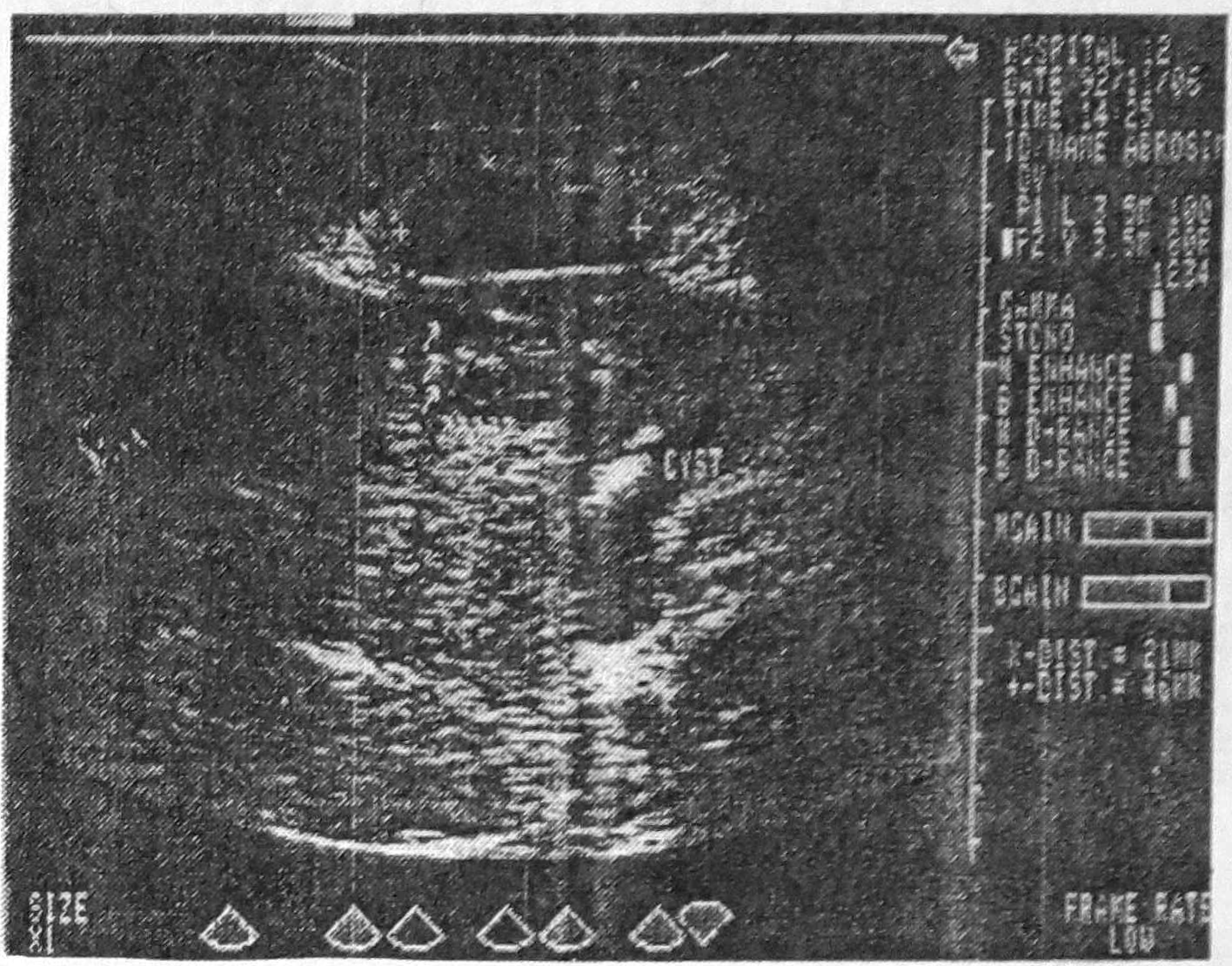 Контрольное ультразвуковое исследование от 16.04.1996 г. выявило в V сегменте полость (16 х 12 мм) с ободком обызвествления (рис. 2), в связи с этим больному периодически проводится специфическая противотуберкулезная терапия.