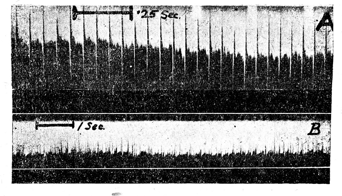 B. Periodic discharge from the isolated abdominal ganglia of Dytiscus marginalis. The discharges occur with the rhythm of the respiratory movements. The electrodes are on one of the nerve trunks attached to the ganglia.