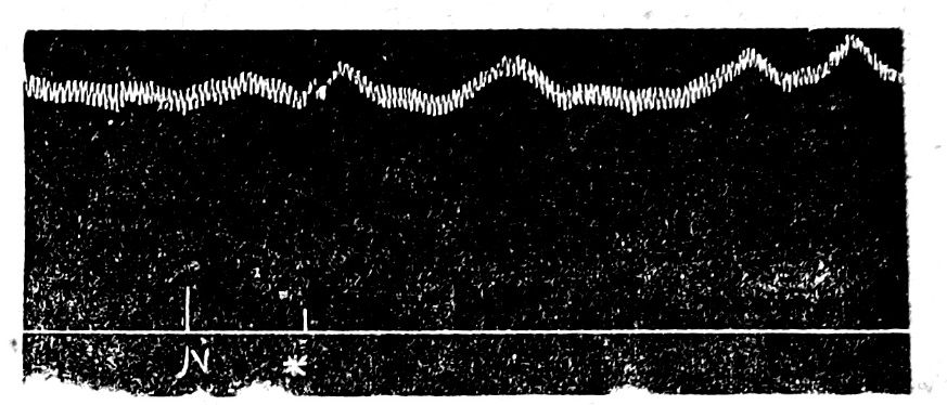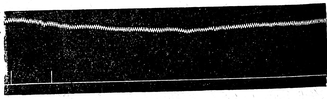 4. Curve 3 (½ nat. vel.). Blood pressure curve. At the bottom is the same mark as on curve No. 2. With the introduction of blood taken from another animal, but already during the irritation of the posterior roots, a decrease in pressure is caused, and then its gradual leveling.
