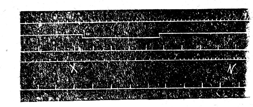 7. Fig. 6. Recording drops in experiment No. 14. The upper line is the effect of irritation of the dorsal roots, the next line is the mark of the expansion of the roots, below is the time in 1'. The lower line is the passage of fluid obtained during the irritation of the roots from the first drug. X is the beginning of the passage of this liquid, which replaced the liquid obtained before irritation.