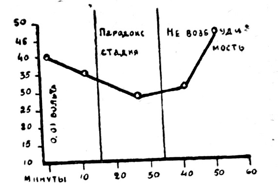 Возбуждение, превратившись в перевзобуждение, становится „стойким ж неколеблющимся“, т. е. не распространяется по нерву или распространяется очень медленно и теряет волнообразный характер. В этом состоянии всякое возбуждение, пришедшее в виде динамической волны в пара-биотический участок затухает, углубляя здесь парабиоз.