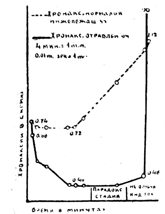 Как видно из таблицы в большинстве случаев мы имеем прямой гетерохронизм =1,5 (прямой гетерохронизм выражается величиной боль шей, а обратный меньшей единицы). В одном случае обратный гетерохронизм равен 0,6, т. е. хронаксия отравленного участка в 1,5 больше, чем нормального. В четырех случаях гетерехронизм приближается к 1, т. е. нерв можно считать изохронным, т. к. увеличение на 0,1 едва выходит за пределы погрешности опыта. Таким образом, парадоксальная стадия характеризуется начинающимся гетерохронизмом, который в некоторых случаях может достигать большой величины. Lapicque считает предельным гетерохронизмом 2; по-видимому, это несколько преуменьшенная цифра, т. к. мы наблюдали и большие цифры, при которых проводимость нерва еще сохранялась.