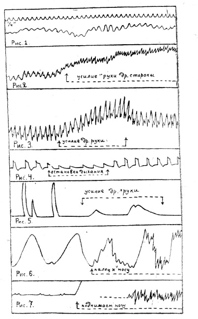 1) Les hypercinésies de tremblement. Des mouvements menus, de 100 à 240 oscillations par minute. Le rythme des ondulations pério diques, les oscillations supplémentaires. L’attitude segmentaire diminue au commencement l’hypercinésie. 2) Les hypercinésies myocloniques. Des mouvements non systématisés, de 100 à 120 fois par minute. L’at titude générale et segmentaire augmente l’hypercinésie. 3) Les brady- hypercinésies systématisées rythmiques. La courbe d’inscription com plexe, parfois stéréotypique, de 20 à 60 mouvements par minute. Une influence remarquable de l’attitude générale. L’arrêt de la respiration di minue sensiblement l’hypercinésie. 4) Les hypercinésies choréiques. Des mouvements «par paquets», d’amplitude et de force differentes. L’attitude segmentaire diminue au commencement l’hypercinésie.