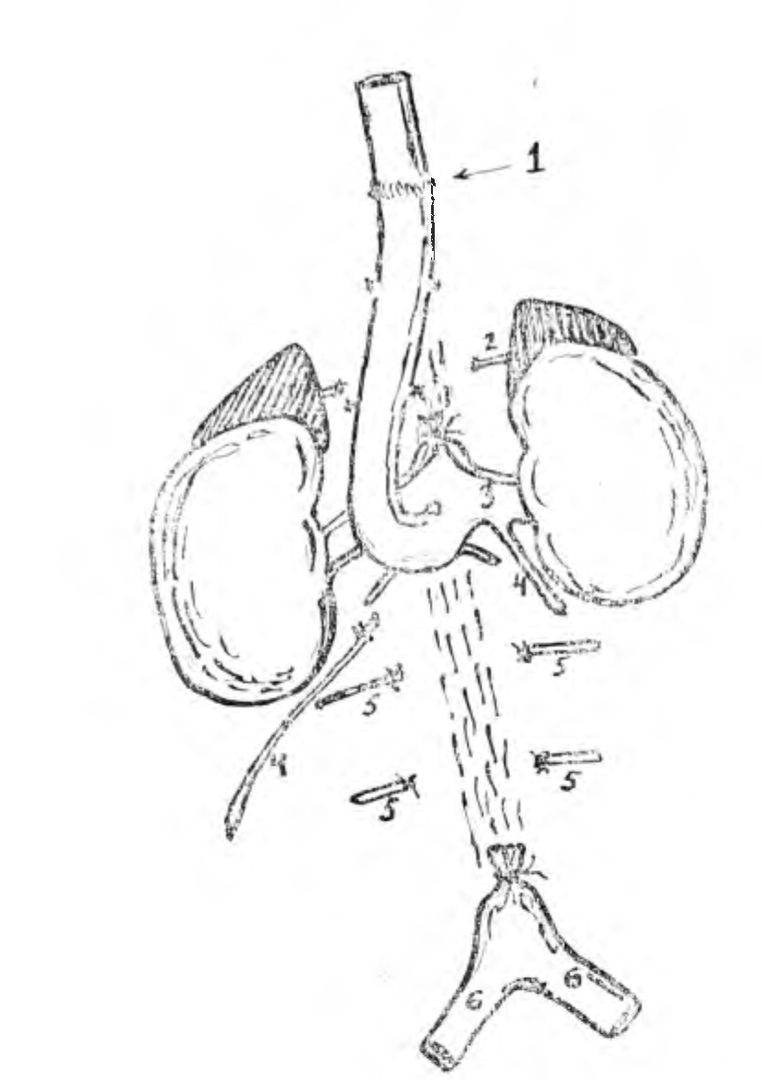 Рис. 1. 1 — место сосудистого шва; 2 — надпочечная вена; 3 — почечная вена; 4 — внутренняя семенниковая вена; 5 — поясничные вены; 6 — общая подвздошная вена.