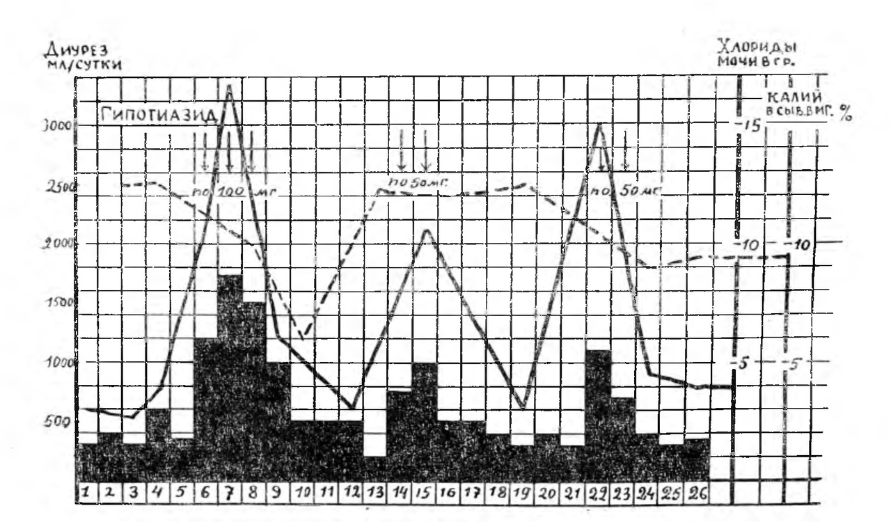 Рис. 1. Влияние гипотиазида на электролиты крови и мочи. Пунктирная линия — калий в крови (в Мг%), прямая линия—хлориды в моче за сутки (в г), столбики — диурез.
