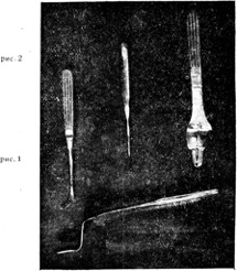 Как видно теперь из описания предлагаемых мною инструментов, техника применения их очень проста. Производится по общеизвестным правилам тот или иной кожный разрез над ущемившейся грыжей; затем вскрывается грыжевой мешок и осматривается его содержимое. Под передний отрезок грыжевого кольца левой рукой осторожно подводится со стороны вскрытого грыжевого мешка грыжевой предохранитель, которым захватывается сразу вся толща кольца, причем ущемленные внутренности не травмируются ввиду того, что свободный конец грыжевого предохранителя приспособлен к анатомическим условиям данной области. Ущемленные же внутренности будут находиться под грыжевым предохранителем, покрытые марлевой салфеткой; грыжевой предохранитель должен быть плотно вставлен в грыжевое кольцо. После этого по его желобку под грыжевое кольцо правой рукой подводится мой герниотом и им рассекается это кольцо, насколько это необходимо.