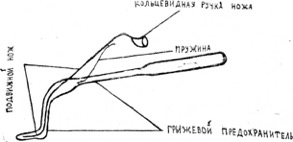 К моему грыжевому предохранителю можно присоединить, вместо вышеописанного герниотома моей конструкции, подвижной изогнутый нож на шарнире, как это изображено на рис. № 5. Этот нож должен помещаться в желобке вышеописанного грыжевого предохранителя и удерживаться при помощи пружины в закрытом состоянии. Это будет наиболее усовершенствованный прибор—автоматический герниотом. При закрытом ноже после вскрытия грыжевого мешка этот автоматический инструмент вводится в грыжевое кольцо и плотно в нем устанавливается. После того как он своим свободным узким концом надлежащим образом фиксирован в грыжевом кольце, большим пальцем руки, удерживающей этот инструмент, надо нажать на подвижной нож и, благодаря этому, будет получено автоматически рассечение ущемляющего грыжевого кольца, Вся техника операции проводится обычным путем. По желанию хирурга можно регулировать величину и направление разреза, придавая то или иное положение этому автомату и изменяя, по мере надобности, силу давления на подвижной нож, укрепленный на этом инструменте.