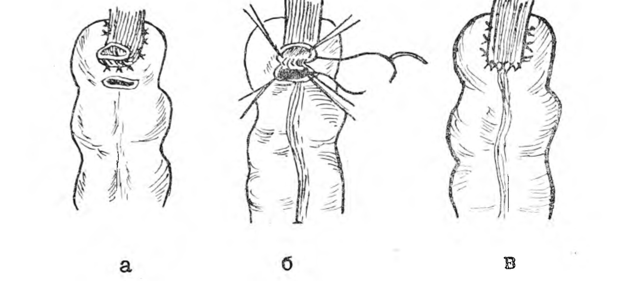 При гастрэктомии аборальный конец поперечно-ободочной кишки зашивается непрерывным кетгутом и кисетным шелковым швом. Затем надсекается брыжейка вдоль краевого сосуда, и мобилизованная кишка подводится к пищеводу. Накладывается анастомоз «конец в бок» между пищеводом и толстой кишкой. Для этого пищевод фиксируется к стенке кишки тремя-четырьмя серозно-мышечными швами. Пищевод пересекается в косом направлении (желудок удаляется), а просвет кишки вскрывается в поперечном (рис. 1, а). Слизистую кишки и пищевода сшивают узловыми шелковыми швами (рис. 1, б). Затем накладывают первый и второй ряд швов на переднюю стенку анастомоза (рис. 1, в). При данной методике толстая кишка как бы муфтообразно прикрывает пищевод, что обеспечивает прочность анастомоза, Дальнейший ход операции одинаков как при субтотальной резекции желудка, так и при гастрэктомии.Рис. 1. Схема наложения анастомоза между пищеводом и толстой кишкой.
