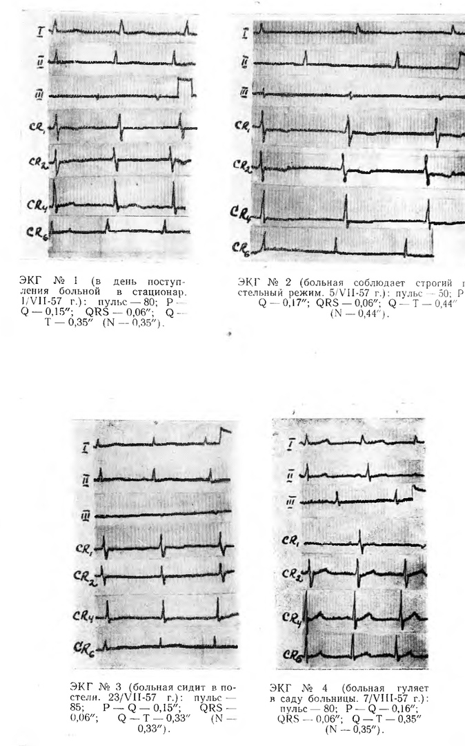 В первую неделю пребывания в стационаре больная соблюдала строгий постельный режим, с 8/VI1 стала сидеть в постели, а с 29/VII ходить—сначала по отделению, затем — гулять в саду. На рис. 1 представлены ЭКГ, снятые 1/VII, 5/VII, 23/V11, 7/VII1-57 г. Под влиянием постельного режима возникла отрицательная ЭКГ- динамика.