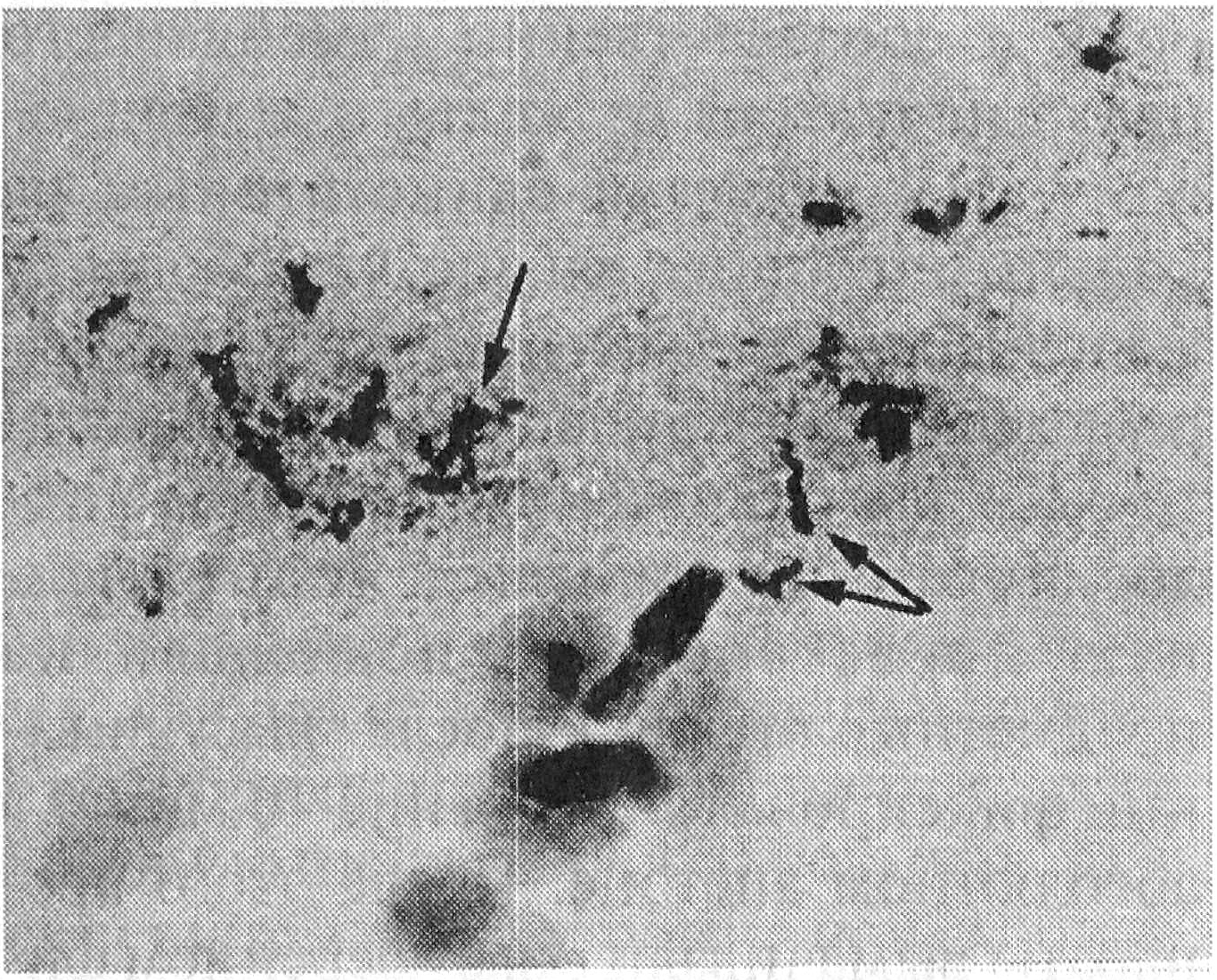 Рис. 1. Мазок со слизистой желудка, окрашенный антителами против Helicobacter pylori. Продукт иммуноцитохимической реакции локализован в бактериях (стрелки), х 900.