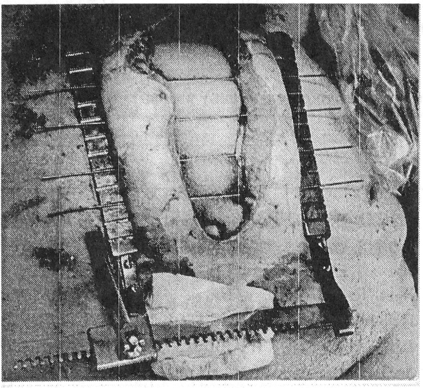 07.02.1994 г. под местной инфильтрационной анестезией 0,25% раствором новокаина наложен спицевой АРА со съемными браншами и с поперечными на них канавками для фиксации спиц. Осуществлена полная хирургическая обработка гнойной раны. Под спицы соразмерно площади дование послеоперационного рубца мягких тканей передней брюшной стенки. В области мышечно-апоневротического слоя выявлено полное сопоставление краев встык с образованием гиперэхогенной зоны по всей длине раны, указывающей на формирование плотного соединительнотканного рубца. Осмотрена через 4 месяца после раны проведена поролоновая губка, пропитанная 10% раствором ксимедона (рис. 1). В этот же день больной разрешили активно поворачиваться в постели, стали проводить более эффективное комплексное лечение пневмонии (подключен массаж спины, надувание резиновых шаров, дыхательная гимнастика), что улучшило отхождение мокроты. На 2-й день пациентке разрешили присаживаться в постели. Первые грануляции появились на 3-й день. Рана очистилась на 4-й день. Продолжали дозированное сближение краев раны и 23.02.1994 г. они были сопоставлены встык. Наложены швы только на кожу. Через 5 дней спицевой аппарат сменен на аппарат с шипами и скобами (рис. 2). Больной было разрешено вставать с постели. Рана зажила первичным натяжением.