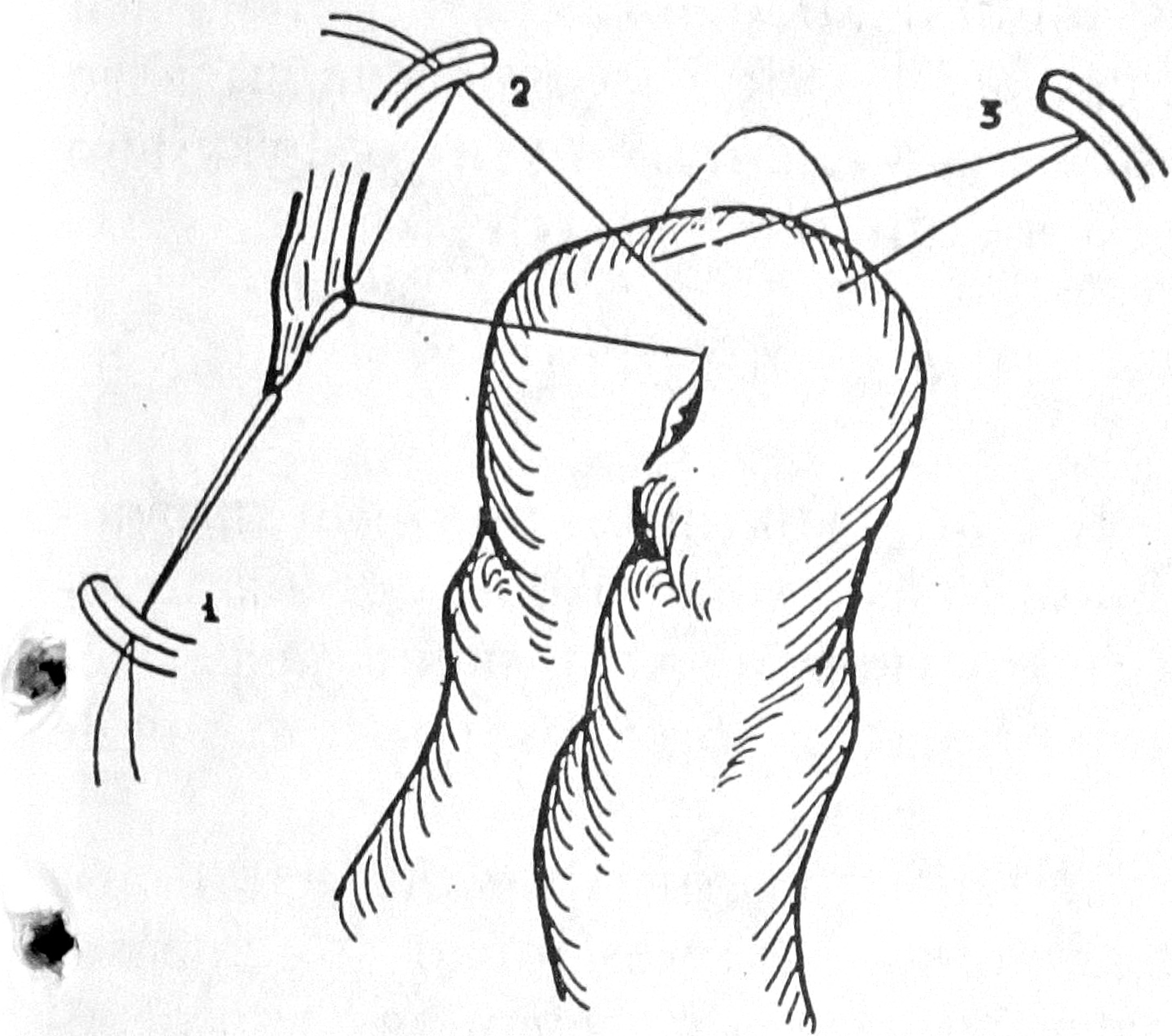 Рис. 1. Подготовленные для соединения петля кишки и желчный проток: 1 — лигатура-держалка, 2 — первый шов анастомоза, 3 — заранее наложенная лигатура для укрытия.