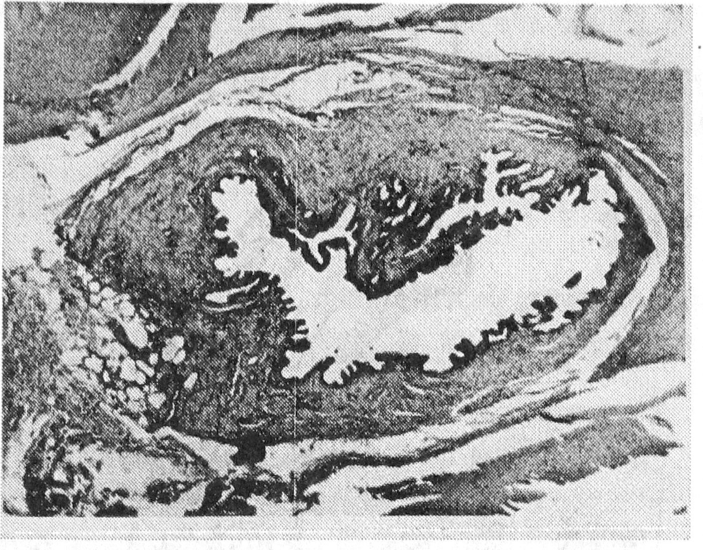 Через месяц после создания анастомоз выглядел следующим образом (рис. 4); толстая собственная пластинка холедоха переходила без отчетливых границ в подслизистую тощей кишки, причем продуктивные очаги были минимальными. Имели место небольшие периваскулярные очаги гистиоцитов и фибробластов по 3—6 клеток, сливавшиеся с гиперхромными клетками перителия венул и капилляров. Слизистая холедоха отличалась неравномерной невысокой складчатостью, эпителий был однослойным цилиндрическим. Пигмент в нем отсутствовал, бокаловидные клетки были редкими. Мышечные волокна холедоха без особенностей. В анастомозе какой-либо патологии, кроме очагового отека, не отмечалось.