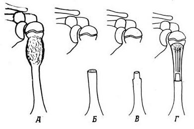 Способ замещения обширных дефектов длинных трубчатых костей: А — схематически изображена костная киста плечевой кости; Б — удален пораженный сегмент кости; В — конец дистального фрагмента материнской кости обработан цилиндрическими фрезами; Г — дефект кости замещен массивным аллотрансплантатом с продольными пропилами.
