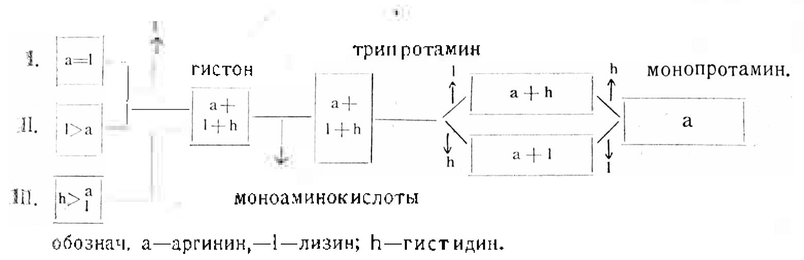 Обычно на этой стадии процесс не останавливается, идет дальше—выделяются моноаминокислоты, и соединение приобретает характер протамина—трипротамин, который через дипротамин (при выделении лизина или гистидина) переходит (соответственно уходит гистидин или лизин), наконец, в монопротамин, состоящий почти напело из аргинина. В ту же схему укладывается развитие белкового компонента спермы и других видов рыб, только отдельные промежуточные стадии не одинаково выражены.