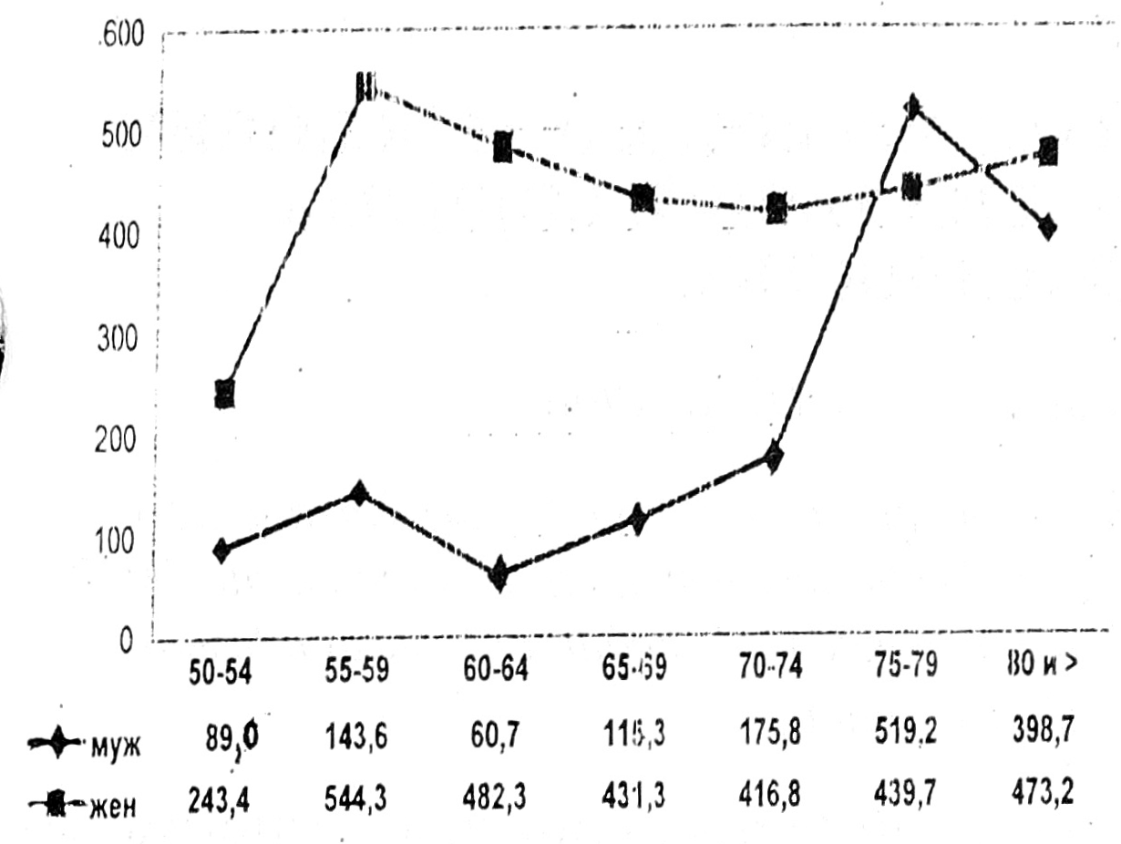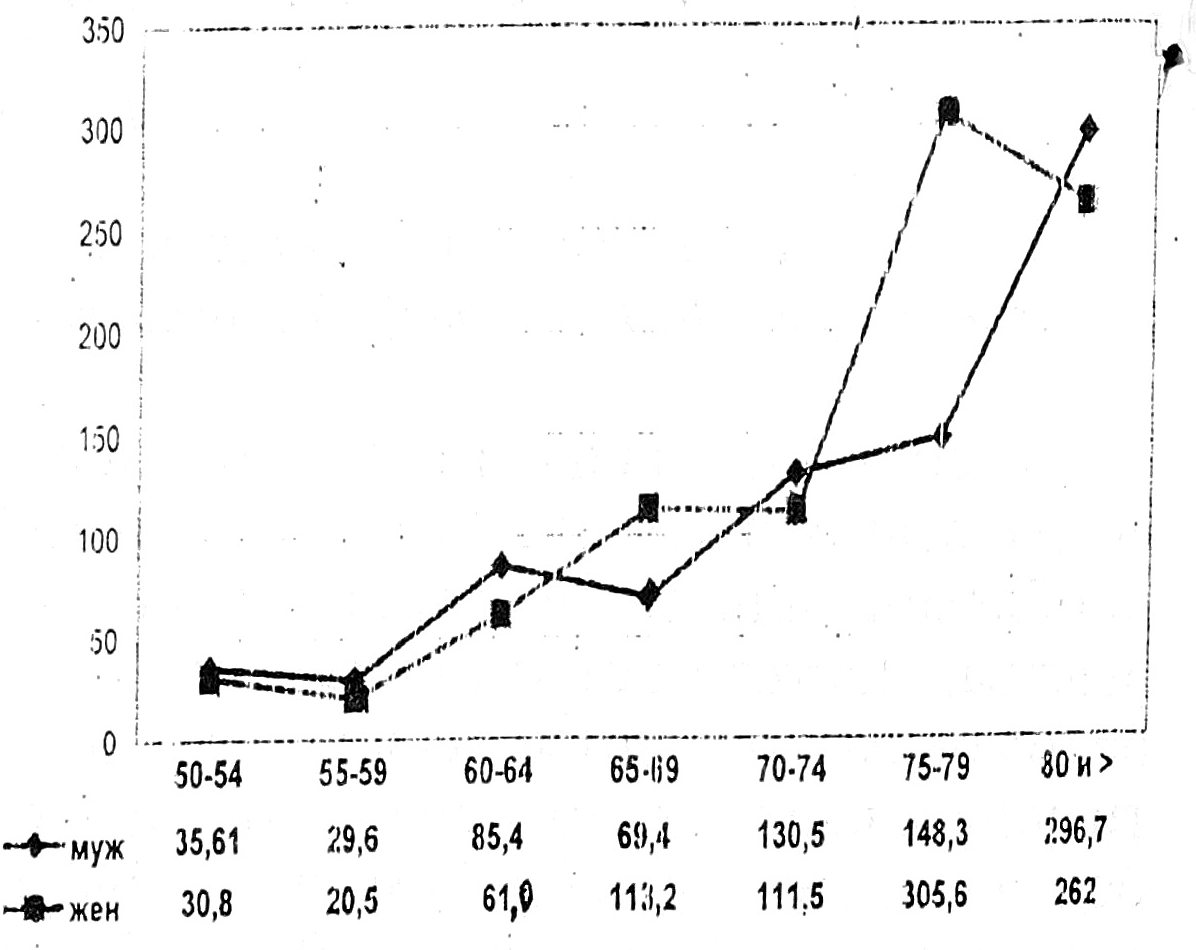 Рис. 1. Частота переломов проксимального отдела бедра от минимальной травмы в зависимости от возраста и пола (г. Отрадный, 1995— 2000 гг.)