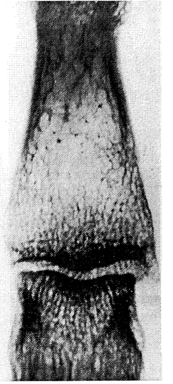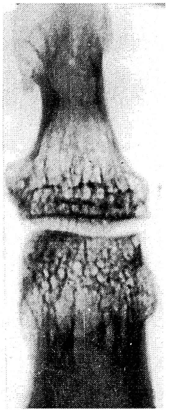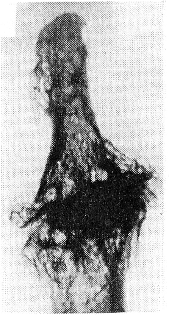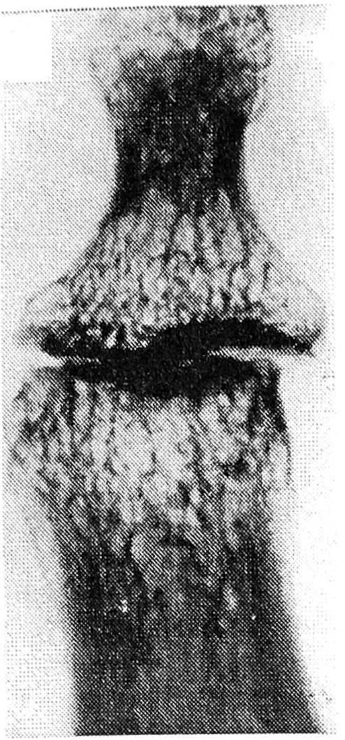Рентгенография с пятикратным увеличением показала, что эпифизы сочлененных костей, деформированные за счет костных разрастаний, имели грубую трабекулярно-ячеистую структуру с наличием множества кист, располагающихся не только в периферических отделах, но и по оси нагрузки сустава. Отчетливо определялись неравномерно выраженный субхондральный склероз, прерывистые контуры замыкающей пластинки, часто с ее разрушением в области суставной впадины или головки и инородные тела, иногда возникавшие вследствие отлома отдельных участков краевых костных разрастаний. При возникновении реактивного синовиита определялись отек и увеличение окружающих параартикулярных мягких тканей (рис. 5).