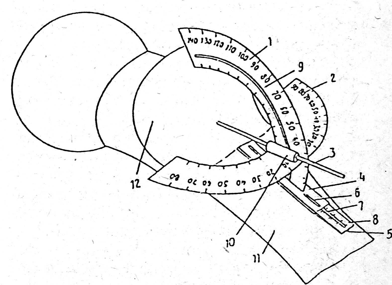Устройство (рис. 1) содержит основание, расположенные на нем во взаимно перпендикулярных плоскостях два транспортира (1 и 2) и спицу (3), связанную с транспортиром (2) посредством ползунка (10). Основание выполнено в виде соединенных и смещаемых относительно друг друга пластин (4 и 5) с соосными прорезями (6 и 7) и линейной шкалой (8). Транспортир ( 1 ) закреплен одним краем на пластине (4) и выполнен с дугообразной прорезью (9), в которой находится с возможностью перемещения транспортир (2). Спица (3) расположена на транспортире (2) с помощью ползуна (10) с отверстием под спицу. Транспортир (2) может быть выполнен в виде двух половин, соединенных осью квадратного сечения, располагаемой в прорези (9).
