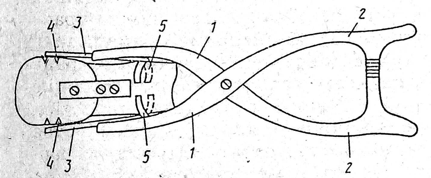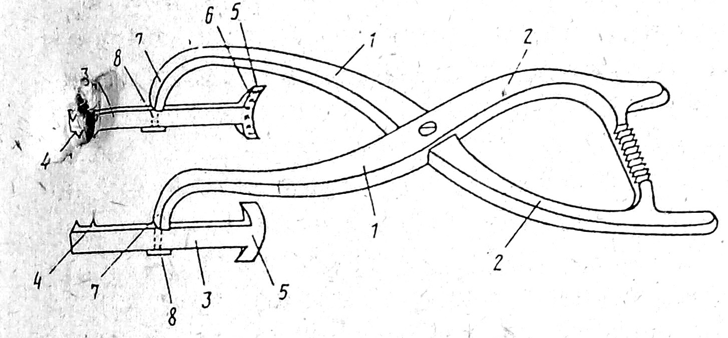 Устройство (рис. 2) содержит две шарнирно соединенные бранши ( 1) с рукоятками (2) и рабочими губками, выполненными на одних концах в виде планок (3) с заостренными шипами (4) с внутренней стороны, а на другом— с С-образными пружинящими фобами (5), имеющими насечки (6) внутренней поверхности. Концы бранш (7) Г-образно изогнуты и расположены в плоскостях, параллельных плоскости симметрии устройства, каждая планка (3) шарнирно соединена (8) с Г-образно изогнутыми браншами (7).