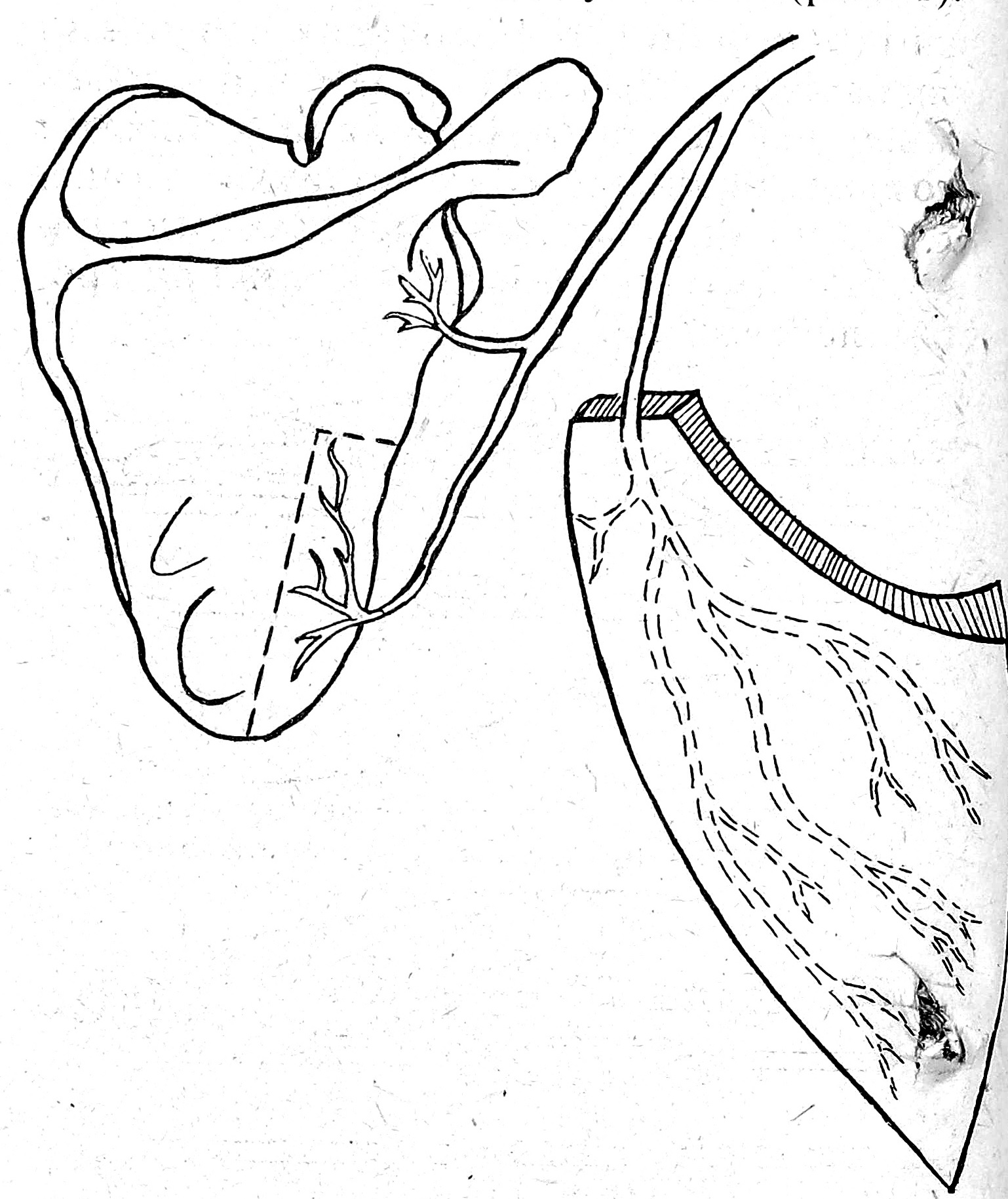 На 30 трупах было проведено 50 секционных исследований по изучению анатомии и техники взятия васкуляризированных костных трансплантатов, которые апробировали в клинике на 18 больных. Относительно новым видом является трансплантат латерального края лопаточной кости, имеющий два раздельных источника кровоснабжения. К верхнему и нижнему краю лопатки раздельно подходит сосудистый пучок, содержащий артерию с комитантными венами, входящий в кость через места прикрепления мышц латерального края лопатки. Каждая из этих артерий на уровне средней и верхней трети лопатки берет начало от торакодорсальной артерии на 4—5 см проксимальнее места ее вхождения в широчайшую мышцу спины (рис. 1).