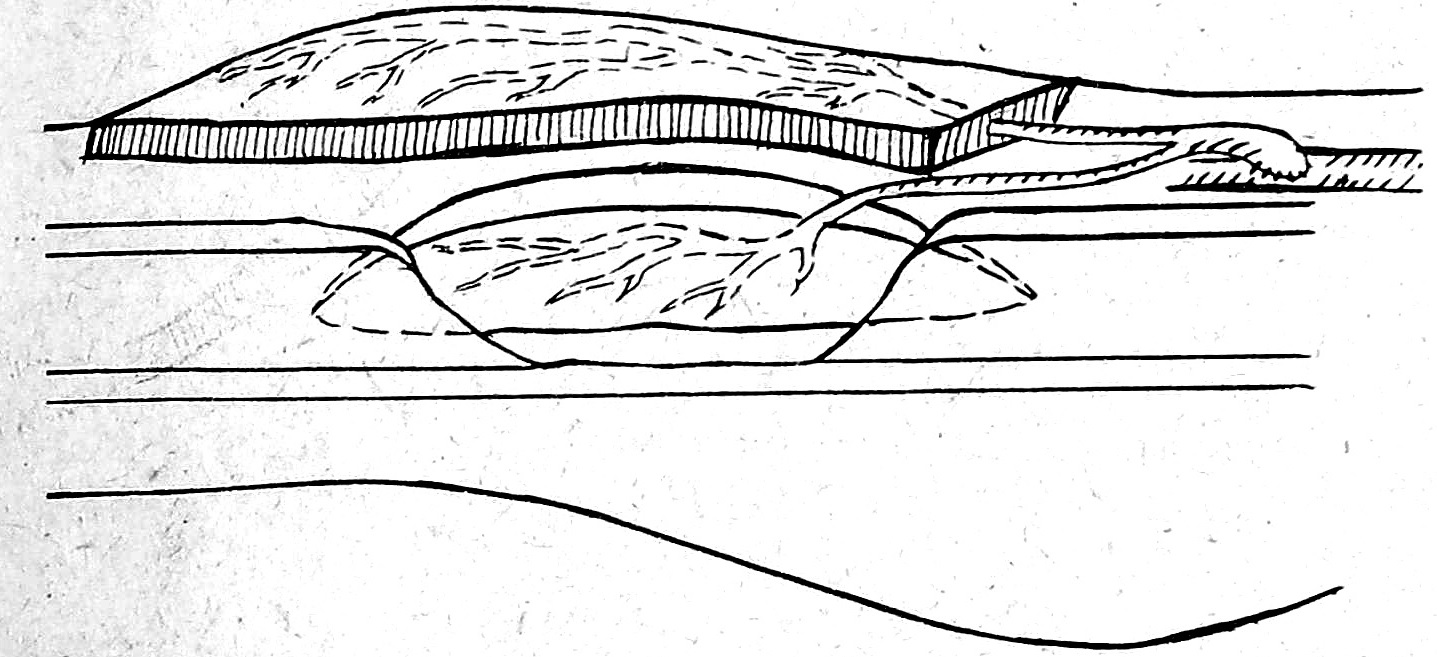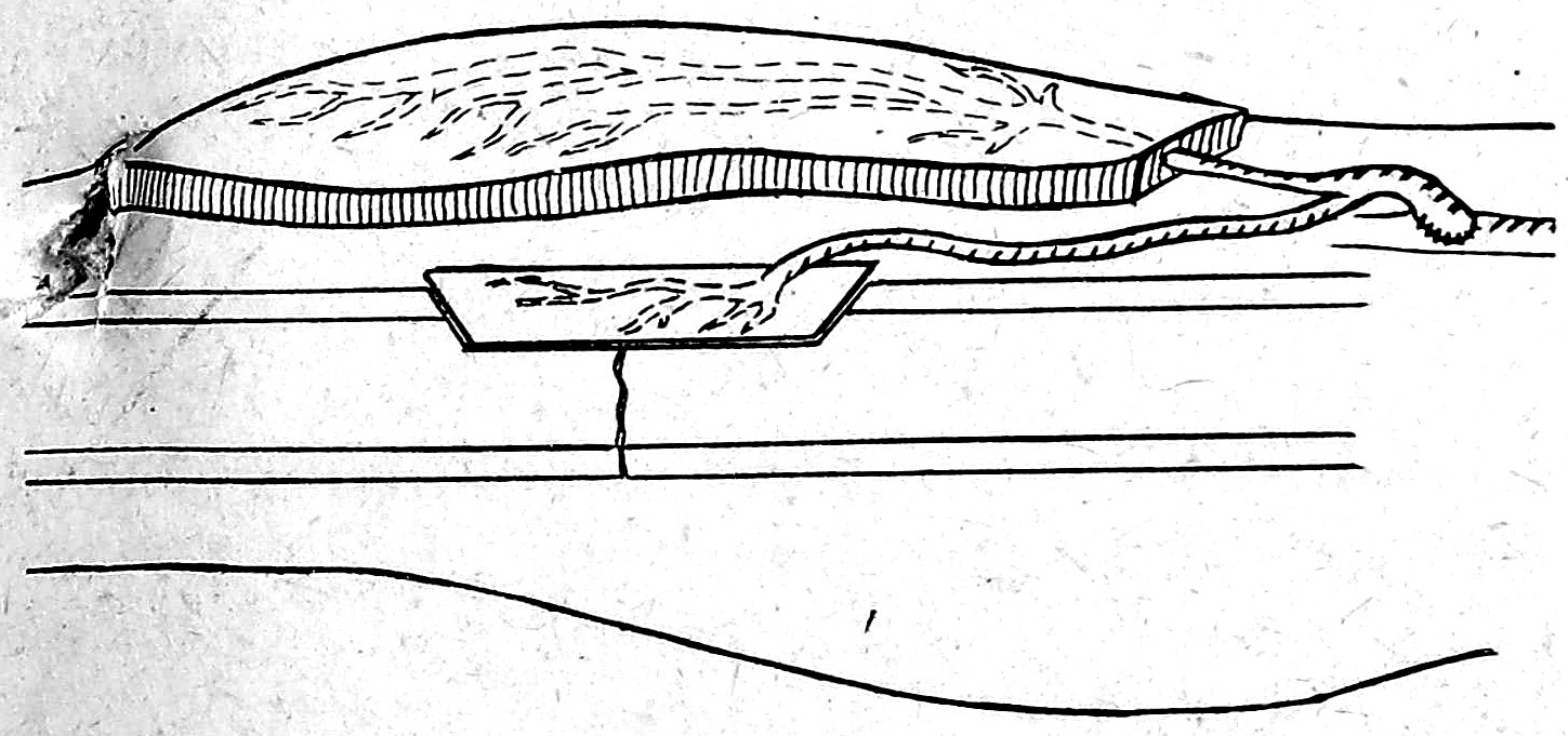Существуют два основных варианта способа реваскуляризации и костной пластики с помощью описанных выше трансплантатов: в виде накладки, когда трансплантат укладывают в заранее сформированное ложе пораженной кости с перекрытием линии ложного сустава или пораженной кости (у 10). При этом виде костной пластики эффективен каждый из этих трансплантатов. Иногда (второй вариант) один трансплантат берут с задней поверхности дистального эпифиза лучевой кости и используют в виде накладки, другой — с задней поверхности шиловидного отростка в виде костного аутоштифта на всю длину кости в заранее подготовленный «канал», при этом выделяют сосудистую ножку от места впадения ее в надкостницу до места отхождения от лучевой артерии (рис. 5). В том и другом вариантах транспозиции с целью «разгрузки» зоны ложного сустава производили резекцию шиловидного отростка после взятия трансплантата.