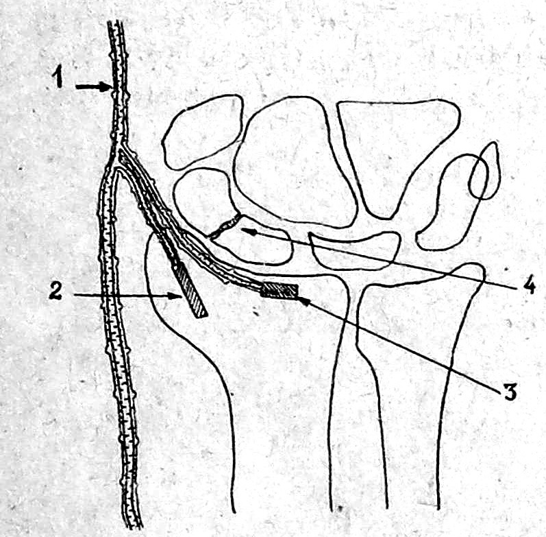 Рис. 4. Трансплантаты из лучевой кости: 1) лучевая артерия; 2) трансплантат с задней части шиловидного отростка; 3) трансплантат с задней части дистального эпифиза лучевой кости у медиального края; 4) зона ложного сустава ладьевидной кости.