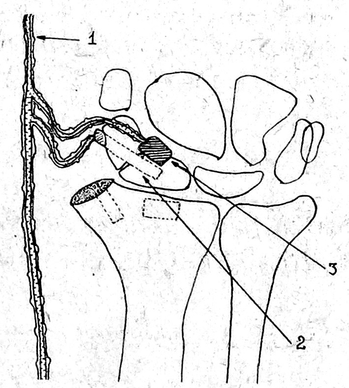 Рис. 5. Транспозиция обоих трансплантатов в зону ложного сустава: 1) лучевая артерия; 2) трансплантат с задней части шиловидного отростка; 3) трансплантат с задней поверхности дистального эпифиза лучевой кости.