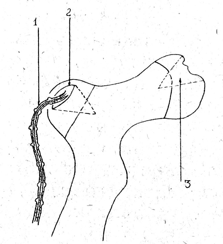 Рис. 6. Трансплантат сегмента большого вертела: 1) сосудистая ножка; 2) трансплантат в виде конуса; 3) зона головки бедра, пораженная деструктивным процессом.