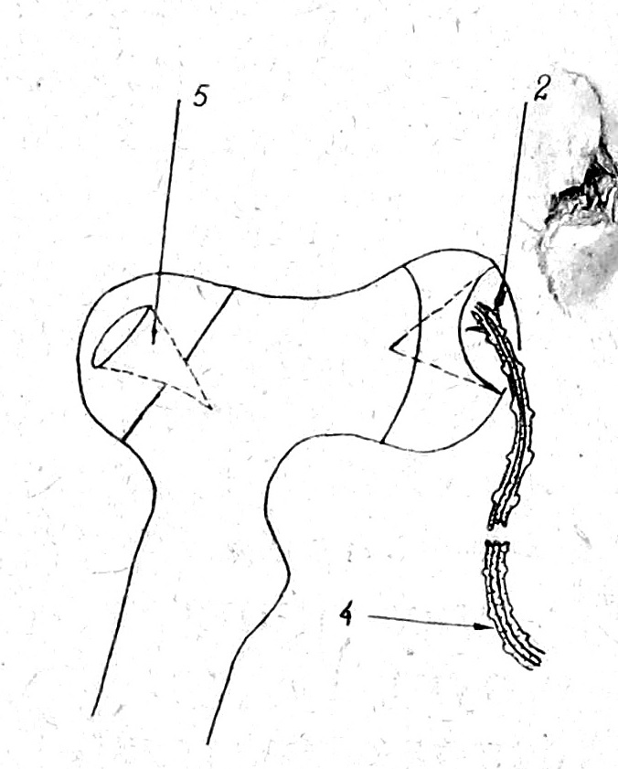 Рис. 7. Трансплантация сегмента большого вертела в зону деструкции: 2) перемещенный трансплантат; 4) восходящая ветвь латеральной артерии огибающей бедренную кость; 5) донорское место.