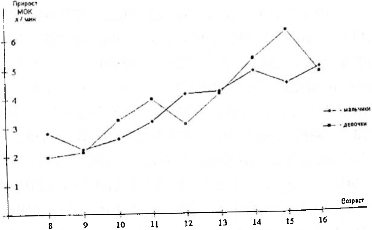 Изменение прироста МОК при нагрузке на велоэргометре мощностью 1,5 Вт/кг у детей в возрасте 8—16 лет.