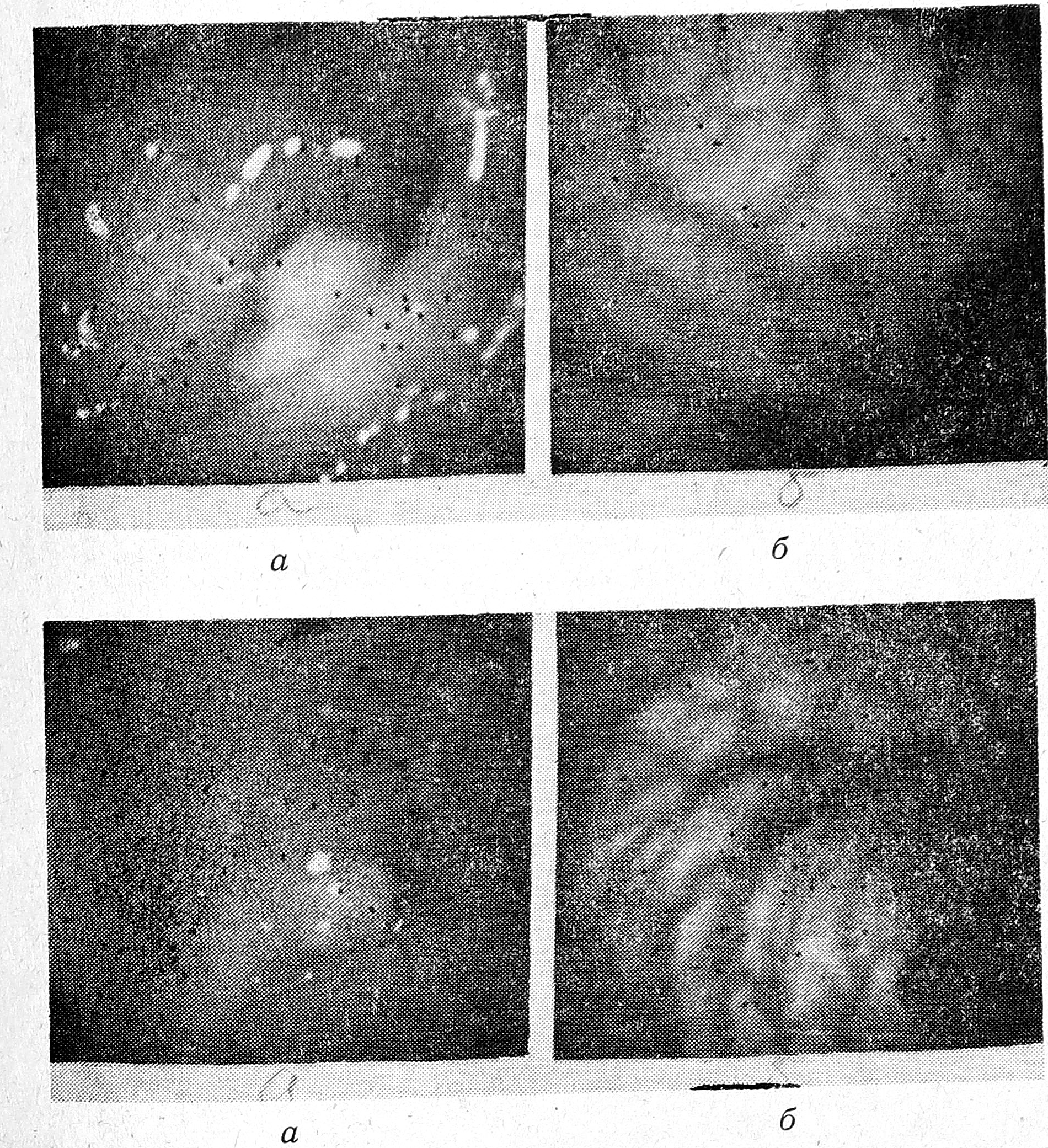 Рис. 1- 2. Картины, заснятые при фиброгастроскопии во время операции: а — полипы, вид в отраженном свете; б — то же в проходящем свете — выключен осветитель эндоскопа, световой поток направлен на стенку желудка извне.
