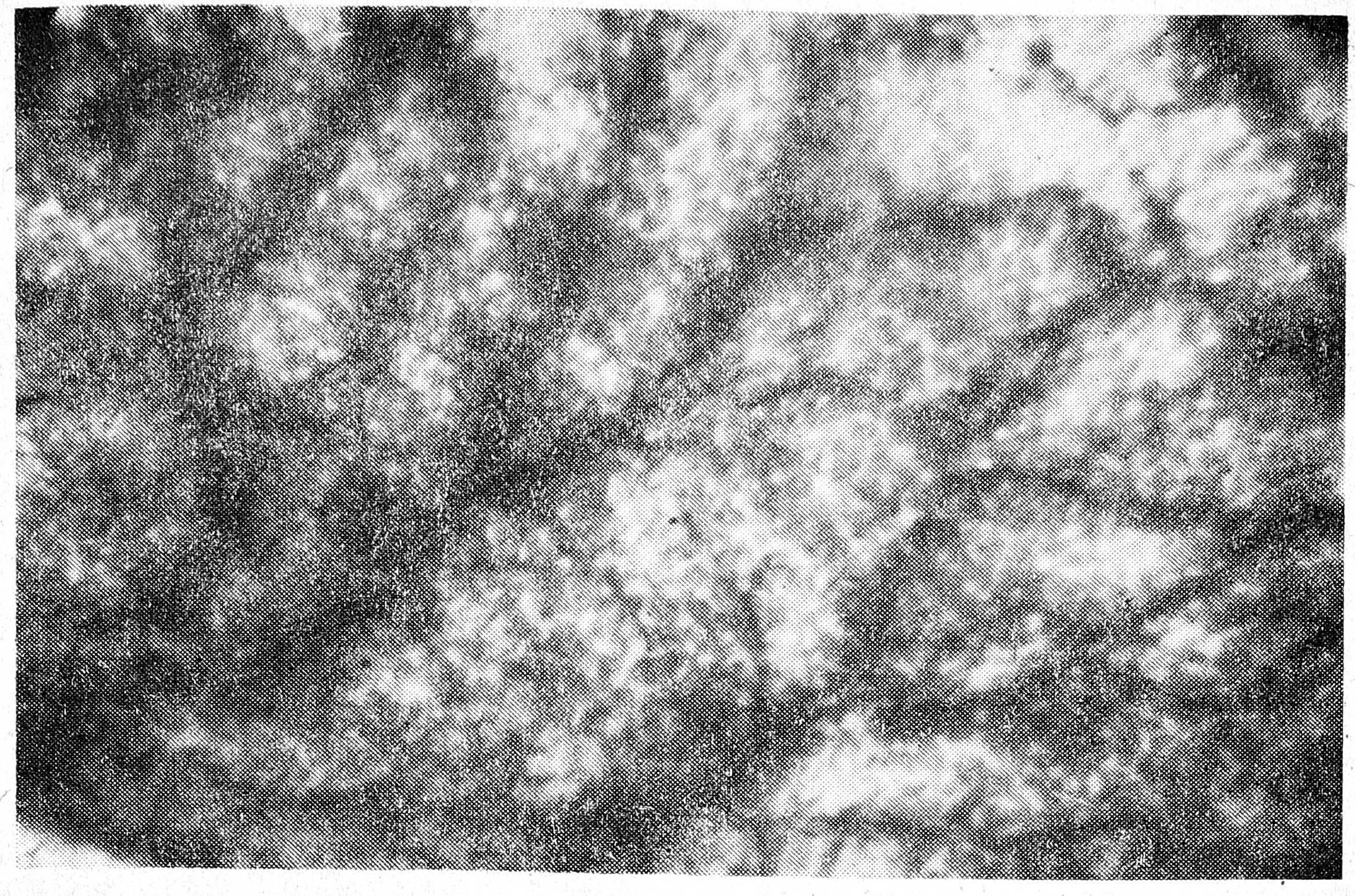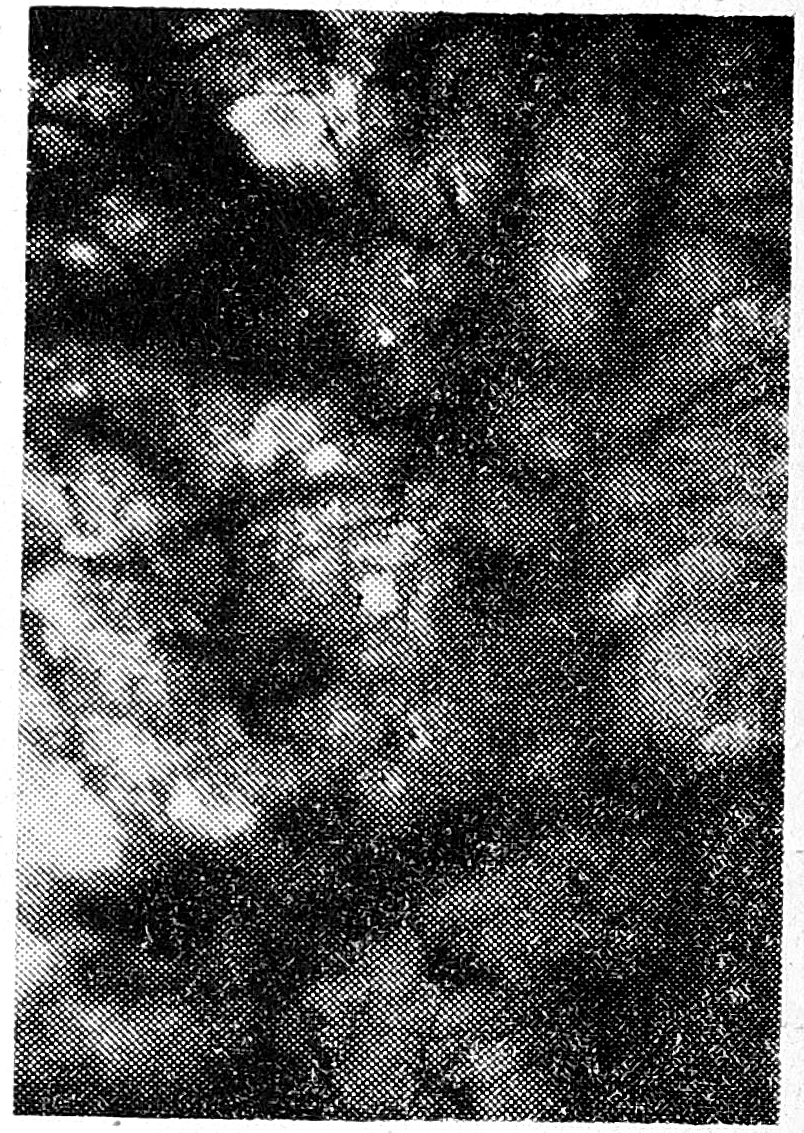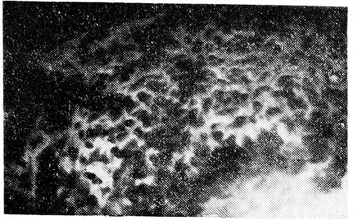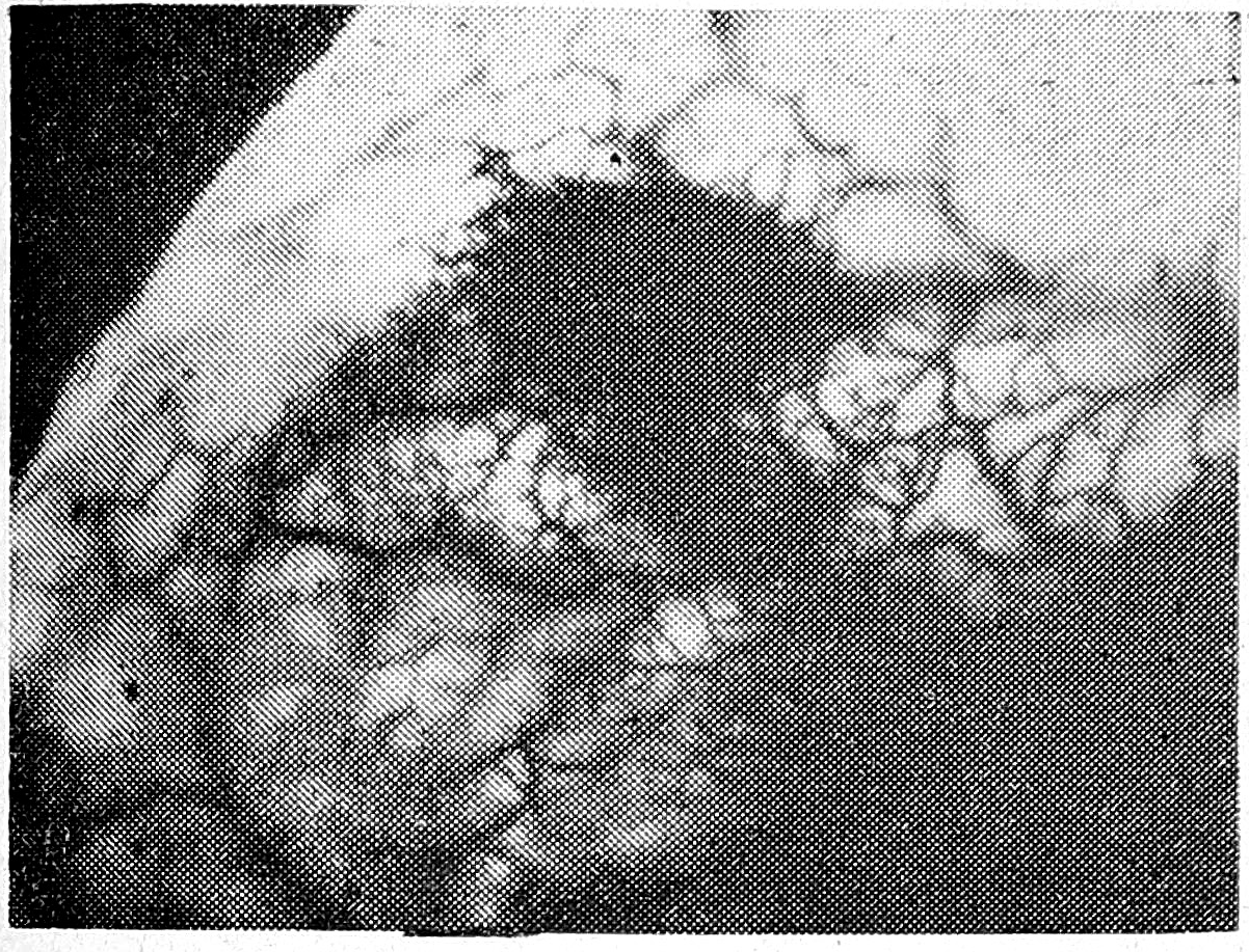 Предлагаемая нами комбинированная методика отличается от применявшихся ранее эндоскопических исследований во время операции следующими особенностями: 1) с ее помощью выявляются изменения в подслизистом слое, в том числе и при интактной слизистой; 2) рисунок патологического очага включает не только видимые в отраженном свете изменения слизистой, но и затенения, связанные с поражением подслизистого слоя; 3) могут быть сопоставлены отличающиеся друг от друга изображения очагов поражения в проходящем и в отраженном свете. Эти картины отражают отличия, возникающие при различных отношениях в системе объект — свет — глаз: а) источник света — серозно-мышечный слой — слизистая — глаз, б) источник света — слизистая — подслизистый слой — серозно-мышечный слой — глаз, в) источник света — слизистая — глаз. Становится возможным обнаружить изменения, которые не могут быть определены при обычных методах эндоскопического исследования. Теневое изображение очага сочетается с рисунком интрамуральных сосудов, прилежащих к нему, а при малой толщине—и интратуморальных ветвей. Атипизм сосудистого рисунка выступает в качестве диагностического признака, что особенно важно. Для распознавания начальных поражений и дифференциальной диагностики с другими малыми очагами поражения: эрозиями, язвами, полипами (рис. 3, 4).