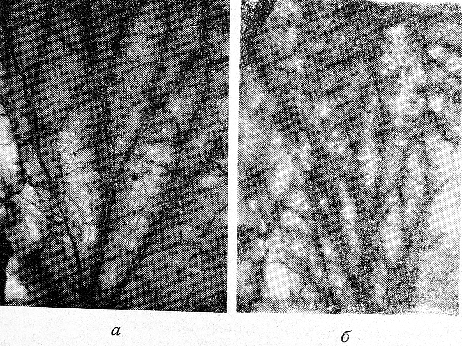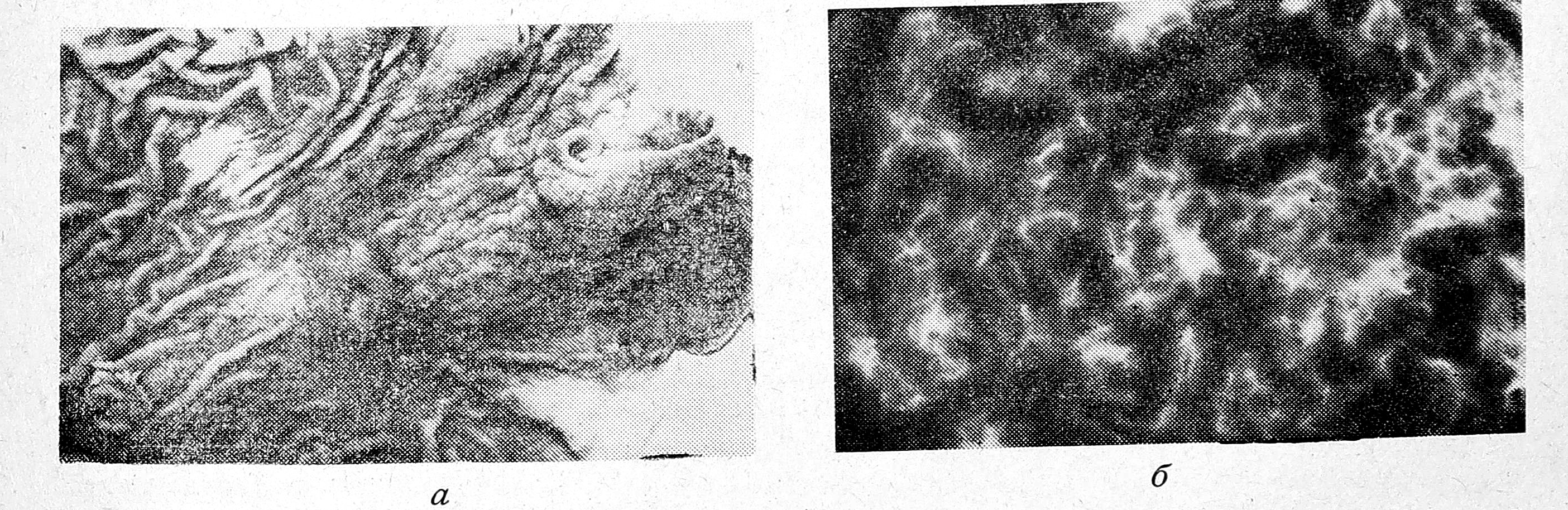 Рис. 5. Экспресс-трансиллюминационная ангиография расщепленного препарата желудка — слизисто-подслизистого слоя: а — световой поток направлен со стороны слизистой; б-у-то же, световой поток со стороны подслизистого слоя.