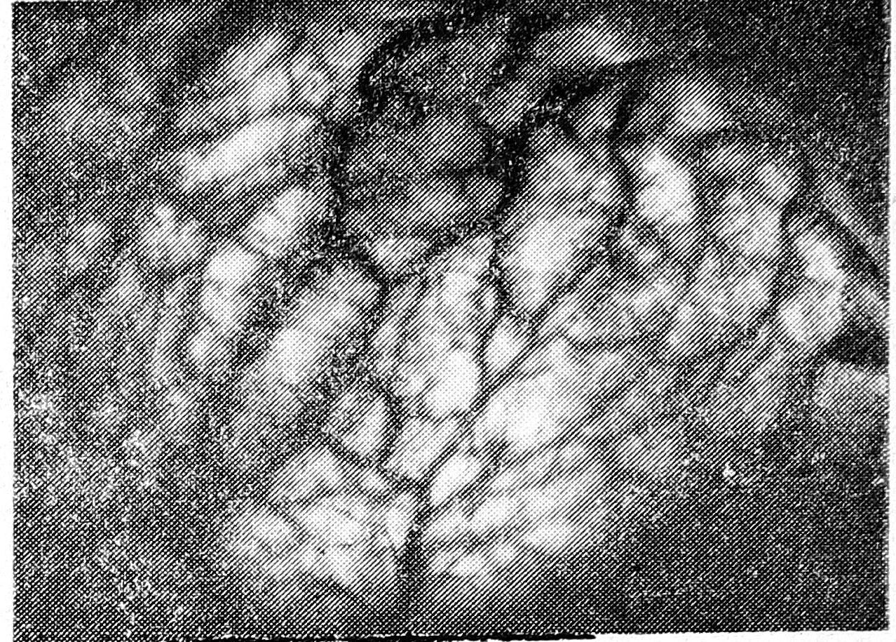 Рис. 6. Трансиллюминационная прямая лимфография препарата желудка. Интерстициальная инъекция 1 % раствора метиленового синего. Видны лимфатические сосуды, окружающие желудочные поля.