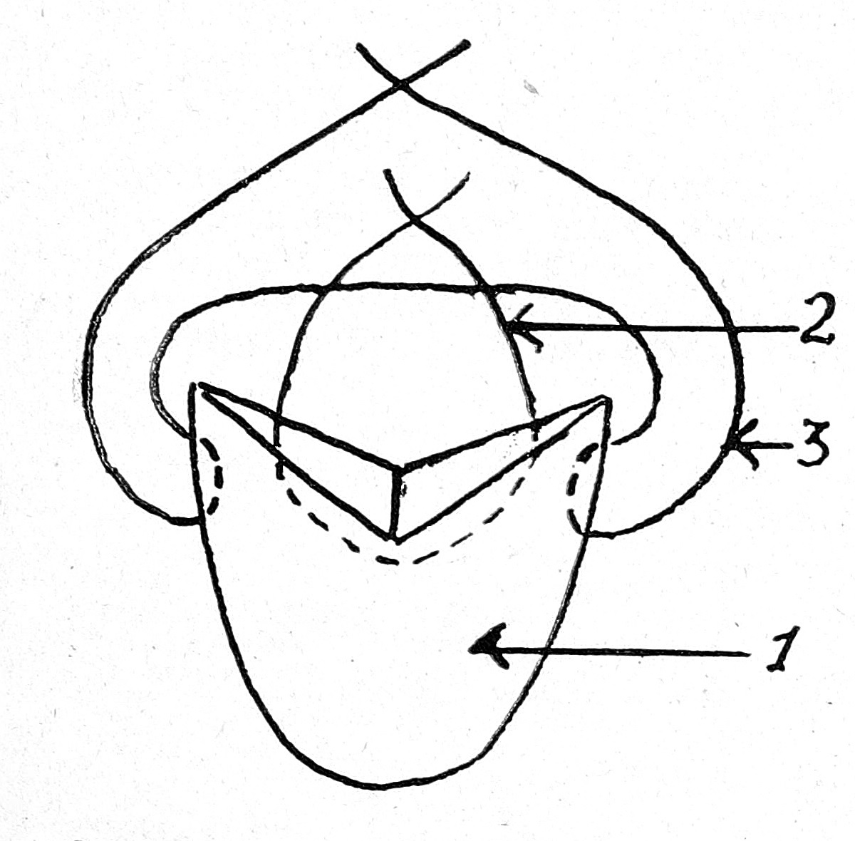Зашивание яичника после клиновидной резекции. Обозначения: 1—резецированный яичник; 2 — погружной непрерывный шов; 3— поверхностный прикрывающий непрерывный шов.